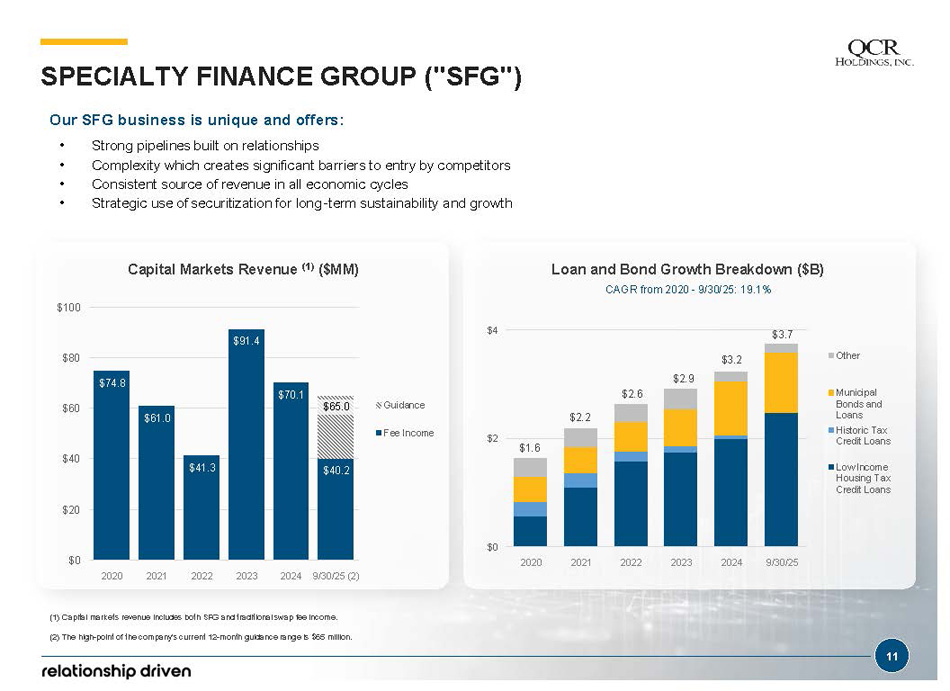 Adjusted Net Income/Earnings Per Share Adjusted Net Income CAGR (1) from 2019 – 9/30/25: 13.5% CONSISTENT IMPROVEMENT IN SHAREHOLDER RETURN • Top quartile ROAA and ROAE performance • Adjusted ROAA grew from 1.15% in 2019 to 1.34% 9/30/25 • Adjusted ROAE grew from 11.53% in 2019 to 11.78% 9/30/25 • Adjusted efficiency ratio improved from 66.25% in 2019 to 57.95% 9/30/25 $59 $63 $100 $115 $115 $119 $123 $3.66 $3.96 $6.27 $6.80 $6.82 $7.03 $7.24 $0.00 2019 2020 2021 2022 2023 2024 9/30/25 (2) Adjus ted Net I ncom e Adjus ted EP S 10 Date as of 9 /30 /25 (1) 201 9 excludes $ 12.3 million gain on sale from the RB&T transaction.
