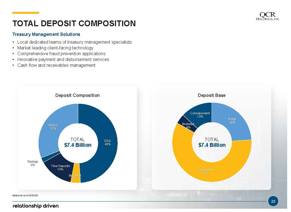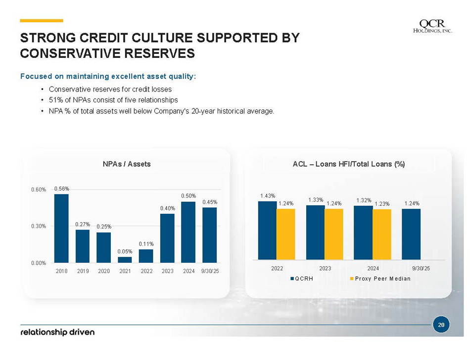6 $2 $1 $0 $3 $4 $5 $6 $7 $8 2020 2021 2022 2023 2024 9 / 30 /25 T otal Loans Comm ercial Loans 17 DIVERSIFIED LOAN PORTFOLIO Construction LIHTC $1,029 (67%) Commercial Construction $425 (27%) Residential Construction $13 (1%) Land Development $78 (5%) Multi - familty - LIHTC $1,187 (79%) Multi - family - non LIHTC $317 (21%) Loan Portfolio Composition ($MM) $7.2 Billion as of 9/30/25 Construction & Land Development ($MM) Multi - Family ($MM) (1) C&I includes direct financing leases C&I (1) $1,728 24% 18 CRE - OO $587 8% CRE - NOO $1,054 15% Construction & Land Dev $1,545 22% Multi - Family $1,504 21% 1 - 4 Family RE $600 8% Consumer $162 2% $226 CRE - Office 14% $976 CRE - Non - Office 16% $516 Construction & Land Dev 7% $316 Multi - Family 14% $1,206 LIHTC 7% $1,029 LIHTC Construction 14% 19 • CRE is 59% of total loans • CRE - Office represents only 3% of Total Loans • 16 CRE - Office loans > $3 million (total of $82 million) • CRE - Office is primarily smaller facilities (three stories or less) and located within the QCRH footprint • Negligible non - performing CRE - Office loans of $2.7 million or 4 basis point of total loans and leases • Over 99% of all CRE loans are performing CRE and CRE Office Key Takeaways: OUR HIGH - PERFORMING CRE PORTFOLIO Balances are as of 9/30/25.