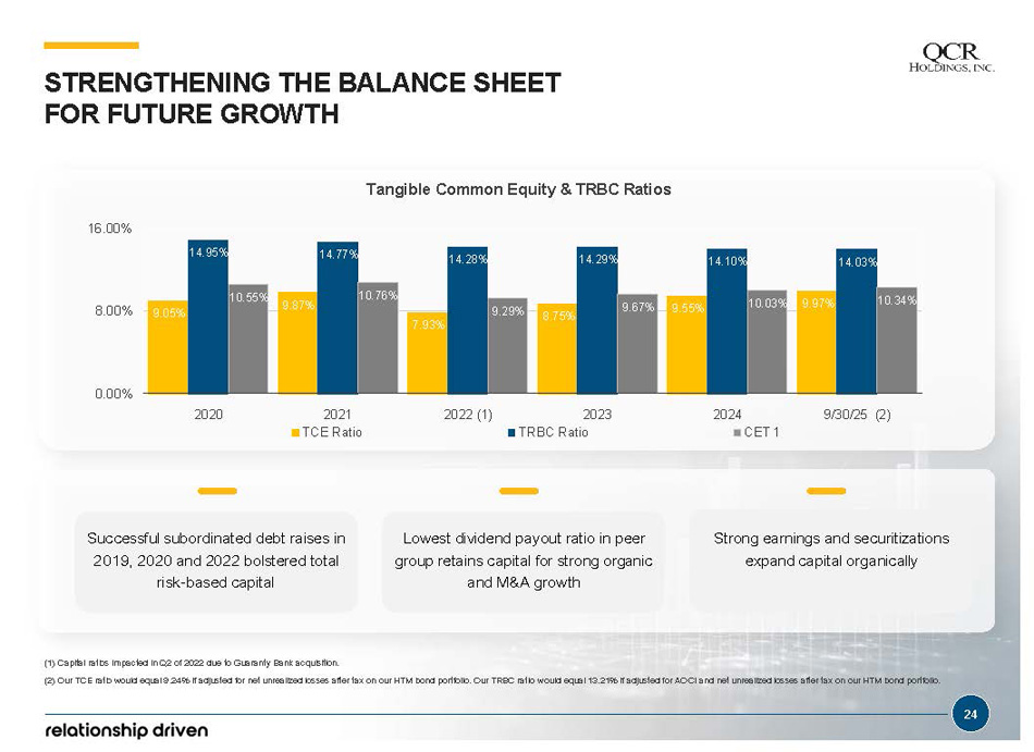 Successful subordinated debt raises in 2019, 2020 and 2022 bolstered total risk - based capital 9.05% 9.87% 7.93% 8.75% 9.55% 9.97% 14.95% 14.77% 14.28% 14.29% 14.10% 14.03% 10.55% 10.76% 9.29% 9.67% 10.03% 10.34% 0.00% 8.00% 16.00% 2020 2022 (1) 2024 9/30/25 (2) 2021 TCE Ratio 2023 TRBC Ratio CET 1 Tangible Common Equity & TRBC Ratios (1) Capital ratios impacted in Q2 of 2022 due to Guaranty Bank acquisition. (2) Our TCE ratio would equal 9 .24 % if adjusted for net unrealized losses after tax on our HTM bond portfolio. Our TRBC ratio would equal 13.21% if adjusted for AOCI and net unrealized losses after tax on our HTM bond portfolio. STRENGTHENING THE BALANCE SHEET FOR FUTURE GROWTH Lowest dividend payout ratio in peer group retains capital for strong organic and M&A growth Strong earnings and securitizations expand capital organically 24