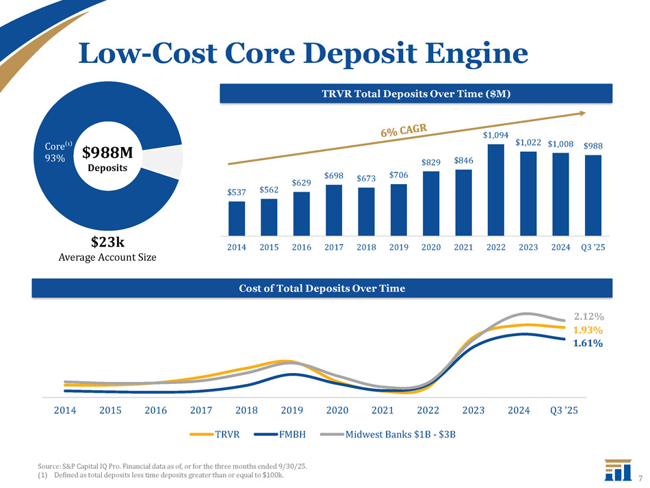 Overview of Two Rivers Financial Group, Inc. A High - Quality Community Bank with a Low - Cost, Core Deposit Engine 5 Source: S&P Capital IQ Pro. Financial data as of, or for the three months ended 9/30/25. (1) Represents bank - level financial data. (2) Defined as total deposits less time deposits greater than or equal to $100k. Loans & Deposits (1) 1.93% Q3 Cost of Total Deposits 5.58% Q3 Loan Yield 93% Core Deposits (2) TRVR: 14 Update as described Des Moines Des Moines Iowa City Burlington Fort Madison Southeast IA IB Demand 46% MMDA + Savings 25% CDs Non - Interest <$100k Bearing CDs 7% 15% ≥$100k 7% CLD 5% Resi. 30% OO CRE 11% Multifam. 3% C&I 12% Consumer 2% Ag. 7% NOO CRE $901M 30% $988M Henry Loans $901M $988M $1.1B Assets $1.2B Deposits $116M Wealth AUM Equity Balance Sheet Performance 0.97% ROAA 25% Fee Income / Revenues 3.30% (1) NIM Credit Quality Capital Ratios (1) 11.6% Leverage Ratio 240% CRE / Tier 1 + ACL 1.29% Reserves / Loans 0.13% LTM NCOs / Avg. Loans Founded : 1904 HQ : Burlington, IA OTCQX Listed : TRVR Entry into Attractive Iowa Markets 6 Source: S&P Capital IQ Pro.