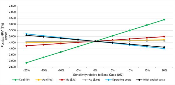 The results show that the Project NPV at an 8% discount rate is most sensitive to changes in copper prices (equivalent changes in Cu grades would produce effectively the same result). The LOM operating costs and the initial capital costs, incurred over the three-year construction period, are the second and third most influential factors affecting the NPV, followed by the price of molybdenum.