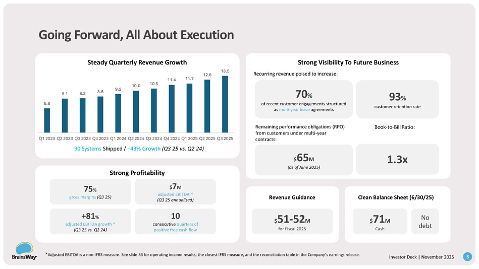 4 Investor Deck | November 2025 Going Forward, All About Execution Steady Quarterly Revenue Growth 90 Systems Shipped / +43% Growth (Q3 25 vs. Q2 24) Strong Profitability Revenue Guidance Clean Balance Sheet (6/30/25) 75 % gross margins (Q3 25) $ 7 M adjusted EBITDA * (Q3 25 annualized) +81 % adjusted EBITDA growth * (Q3 25 vs. Q2 24) 10 consecutive quarters of positive free cash flow 70 % of recent customer engagements structured as multi - year lease agreements 93 % customer retention rate Strong Visibility To Future Business Recurring revenue poised to increase: Remaining performance obligations (RPO) from customers under multi - year contracts: $ 65 M (as of June 2025) $ 51 - 52 M for Fiscal 2025 Book - to - Bill Ratio: 1.3x $ 71 M Cash No debt 5.8 * Adjusted EBITDA is a non - IFRS measure. See slide 33 for operating income results, the closest IFRS measure, and the reconciliation table in the Company’s earnings release. 5 Investor Deck | November 2025 8.1 8.2 8.6 9.2 10.0 10.5 11.4 11.7 12.6 13.5 Q1 2023 Q2 2023 Q3 2023 Q4 2023 Q1 2024 Q2 2024 Q3 2024 Q4 2024 Q1 2025 Q2 2025 Q3 2025 The ARR Model 4.6 5.5 5.6 6 6.1 6.7 6.8 7.4 7.2 8.1 8.8 2 2.3 2.7 3 3 3.3 3.7 4 4.3 4.5 4.7 - 2.9 - 0.6 0.3 0.8 0.7 1.2 1.1 1.4 1.3 1.5 2.0 Q1 - 2023 Q2 - 2023 Q3 - 2023 Q4 - 2023 Q1 - 2024 Q2 - 2024 Q3 - 2024 Q4 - 2024 Q1 - 2025 Q2 - 2025 Q3 - 2025 Sale Lease Adj.