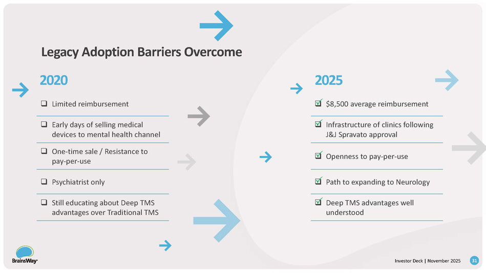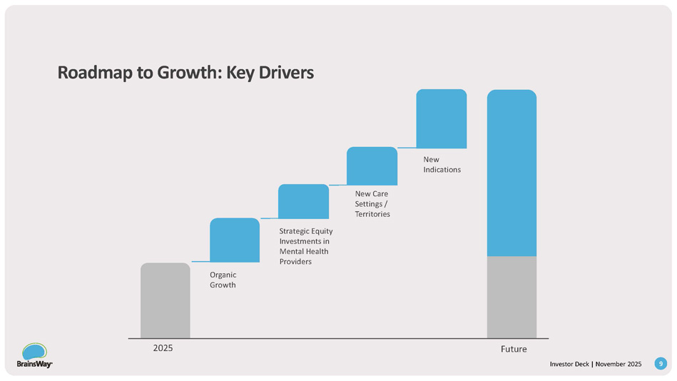 Advanced Noninvasive Neurostimulation Treatments for Mental Health Disorders Investor Deck November 2025 Nasdaq/TASE: BWAY Investor Deck | November 2025 Safe Harbor and Non - GAAP/IFRS Financial Measures 2 Investor Deck | November 2025 This presentation does not constitute a n offer o r invitation to sell o r issue, o r any solicitation of a n offer to subscribe for o r acquire, any securities of th e Company, nor to participate i n any investment . This presentation shall not constitute advertising o r b e construed as commercial o r promotional i n nature . No representation o r warranty is made as to the accuracy o r completeness o f this presentation . You must make your own investigation and assessment of the matters contained herein . I n particular, n o responsibility is assumed as to th e achievement o r reasonableness of any forecasts, estimates, o r statements as to prospects contained o r referred to i n this presentation . This presentation contains information that includes or is based on forward - looking statements within the meaning of the federal securities laws . Such statements are not guarantees of future performance . They reflect current expectations and ar e subject to risks and uncertainties that could cause actual results to differ materially from those expressed o r implied . Factors include, bu t ar e not limited to : continued business impact from COVID - 19 ; adverse economic conditions ; changes i n demand and pricing ; manufacturing difficulties o r delays ; legislative and regulatory actions ; changes in reimbursement ; third - party payor decisions ; product liability claims ; U . S . healthcare reform ; financial market conditions ; competitive dynamics ; failure to achieve sufficient market adoption ; regulatory actions o r delays ; and our ability to realize expected operational and manufacturing efficiencies . Additional information about these and other risks is contained i n our filings with the U . S . Securities and Exchange Commission . If one o r more o f these factors materialize, o r i f underlying assumptions prove incorrect, actual results may differ materially . This presentation also includes market and industry data from government and private publications and internal estimates and projections based o n a number of assumptions . W e undertake n o obligation to update any forward - looking statement as a result of new information, futureevents, o r otherwise . Certain non - GAAP/IFRS financial measures are included in this presentation . These measures are presented to complement the financial information prepared in accordance with IFRS because management believes they are useful to investors . For example, Adjusted EBITDA, a non - IFRS measure, is widely used by investors and securities analysts to evaluate a company’s operating performance without regard to one - time items (such as restructuring and litigation expenses) that can vary substantially from company to company . Management also uses Adjusted EBITDA with IFRS measures for planning purposes, including preparation of annual operating budgets, as a measure of operating performance . These non - GAAP/IFRS measures should be considered only as supplementsto, andnot superiorto, financial measures prepared in accordancewith IFRS . Othercompanies may calculate similarly titled non - GAAP/IFRS measures differently than the Company .