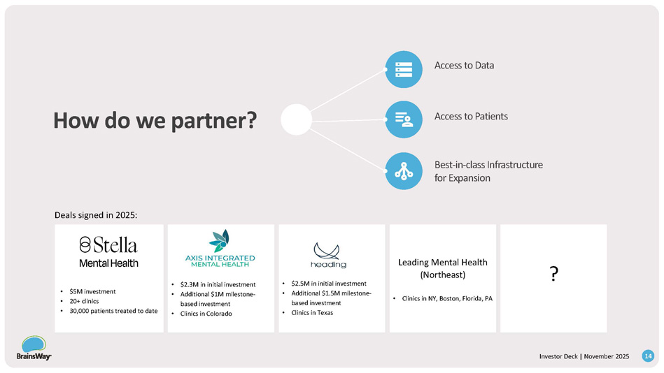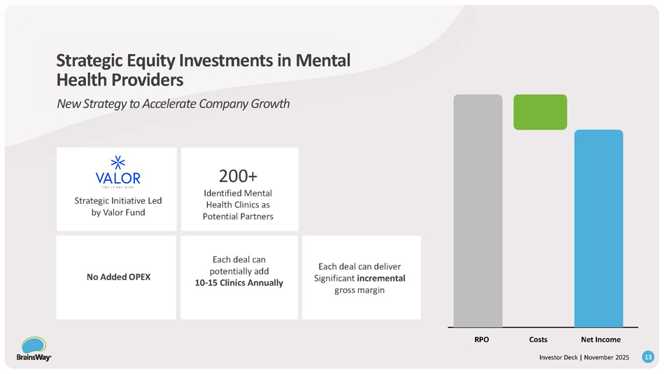 Strategic Partnership With Valor Equity Partners 12 Investor Deck | November 2025 Valor, a leading $20B equity firm behind market leaders, is now BrainsWay’s largest investor and an active partner in our scale strategy RPO Costs Net Income 200+ Identified Mental Health Clinics as Potential Partners Strategic Initiative Led by Valor Fund Each deal can deliver Significant incremental gross margin Each deal can potentially add 10 - 15 Clinics Annually No Added OPEX Strategic Equity Investments in Mental Health Providers New Strategy to Accelerate Company Growth 13 Investor Deck | November 2025
