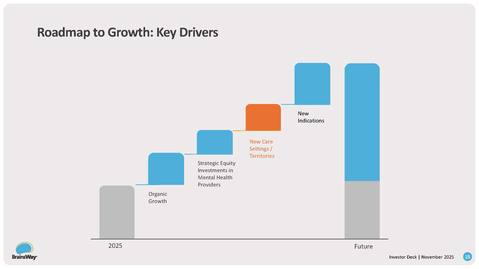 • $5M investment • 20+ clinics • 30,000 patients treated to date • $2.3M in initial investment • Additional $1M milestone - based investment • Clinics in Colorado • $2.5M in initial investment • Additional $1.5M milestone - based investment • Clinics in Texas Leading Mental Health (Northeast) • Clinics in NY, Boston, Florida, PA ? How do we partner? Deals signed in 2025 : 14 Investor Deck | November 2025 Access to Data Access to Patients Best - in - class Infrastructure for Expansion Roadmap to Growth: Key Drivers New Indications New Care Settings / Territories Strategic Equity Investments in Mental Health Providers Organic Growth 2025 Future 15 Investor Deck | November 2025