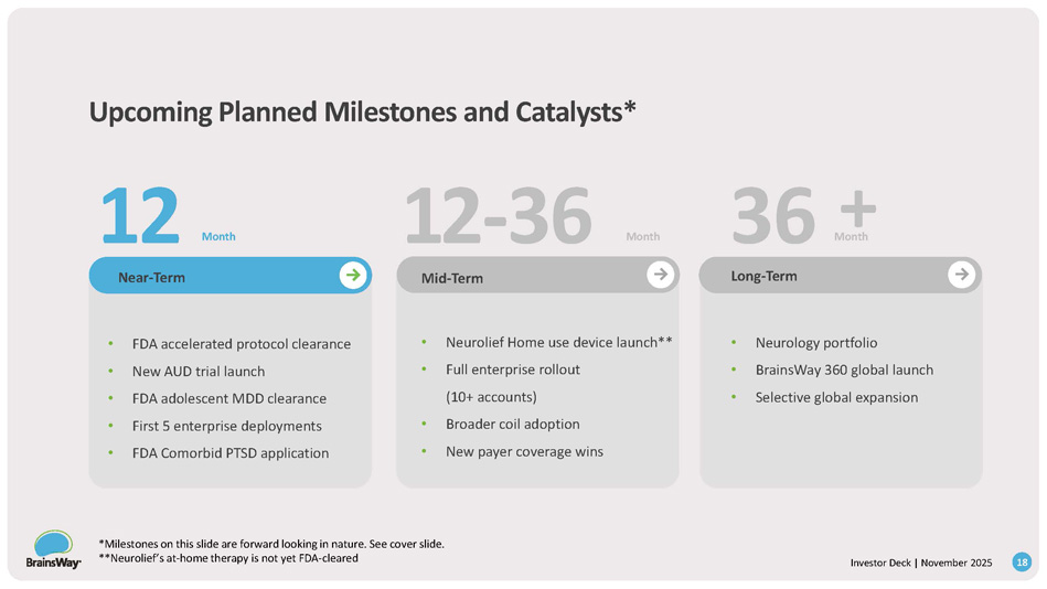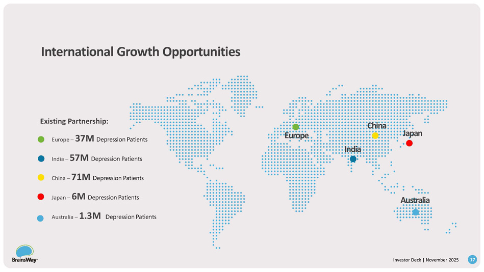 03 02 01 Explore extending deep TMS treatments with At - home* therapy - start in clinic, continue at home 04 Bigger reach: taps ~50% telemedicine activity, clinic - prescribed home device grows TAM without extra marketing and feeds in - clinic use. Patients can go directly to their primary care physician (PCP) Structured deal: $5M convertible debt; milestone tranches; call option to acquire Clean P&L: no consolidation, no added OPEX Extending to Home - Use Neuromodulation August 21, 2025: Announced Structured M&A Option *Neurolief’s at - home therapy is not yet FDA - cleared I I nv v es s t t or r Dec c k k | | S N e o p v tembe r r 2025 16 Europe – 37M Depression Patients India – 57M Depression Patients China – 71M Depression Patients Japan – 6M Depression Patients Australia – 1.3M Depression Patients Existing Partnership: Europ e India China Australia Japan International Growth Opportunities 17 Investor Deck | November 2025