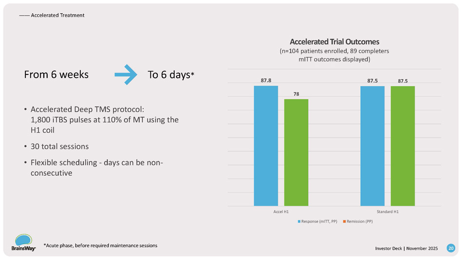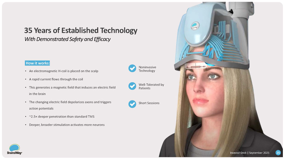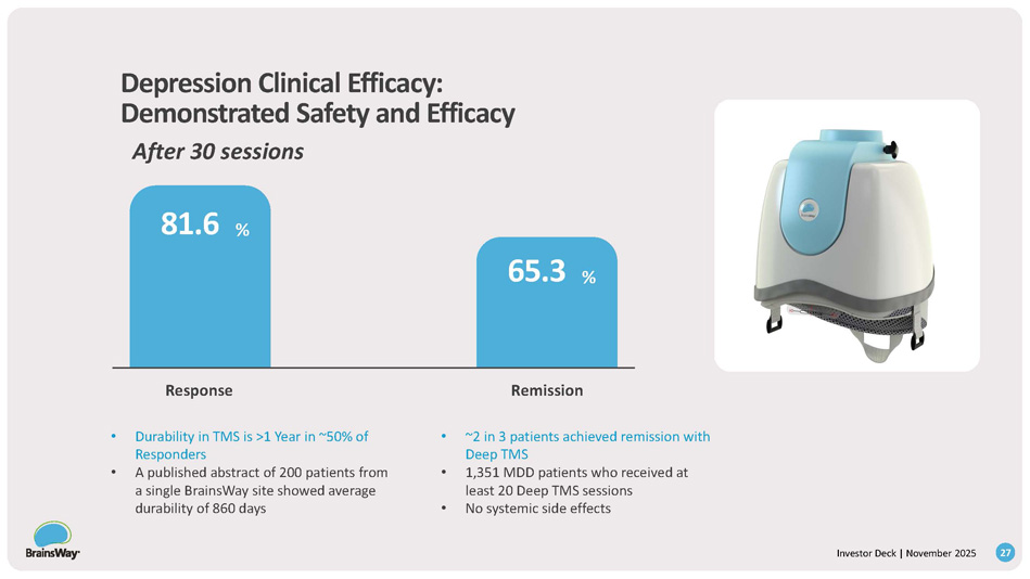 How it works: • An electromagnetic H - coil is placed on the scalp • A rapid current flows through the coil • This generates a magnetic field that induces an electric field in the brain • The changing electric field depolarizes axons and triggers action potentials • ~2.5 п deeper penetration than standard TMS • Deeper, broader stimulation activates more neurons Noninvasive Technology Well - Tolerated by Patients Short Sessions 35 Years of Established Technology With Demonstrated Safety and Efficacy Investor Deck | November 2025 Investor Deck | September 2025 25 Investor Deck | November 2025 All competitors in the commercial depression space use variations of the traditional “figure - 8” TMS coil design Technological distinctions do not necessarily correlate with clinical outcomes BrainsWay Deep TMS Traditional TMS 1.8 to 2.0 cm 9,10 Extensive - 17 cm 10 More Reliable Targeting Deep and Broad RCT Data in Multiple Indications 0.7cm to 1.0 cm 9 Limited - 3 cm 10 Prone to Targeting Errors Superficial and Focal RCT Data Limited to Depression Features Depth Brain Volume Stimulated Therapy Delivery Structures Treated Technology Platform BrainsWay Deep TMS vs. Traditional TMS Clear, compelling technological advantage 26