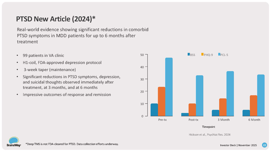 Pre - tx Post - tx 3 Month 6 Month 20 10 0 40 30 50 BSS *Deep TMS is not FDA - cleared for PTSD. Data collection efforts underway. 22 Investor Deck | November 2025 PHQ - 9 PCL - 5 PTSD New Article (2024)* Real - world evidence showing significant reductions in comorbid PTSD symptoms in MDD patients for up to 6 months after treatment • 99 patients in VA clinic • H1 - coil, FDA - approved depression protocol • 3 - week taper (maintenance) • Significant reductions in PTSD symptoms, depression, and suicidal thoughts observed immediately after treatment, at 3 months, and at 6 months • Impressive outcomes of response and remission Timepoint Hickson et al., Psychiat Res.