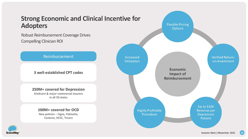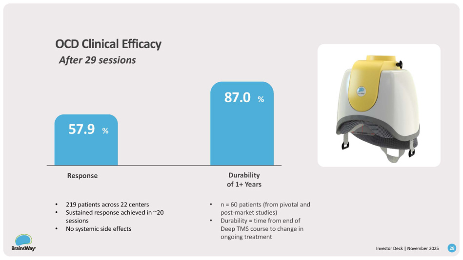 Depression Clinical Efficacy: Demonstrated Safety and Efficacy After 30 sessions 81.6 % Remission 65.3 % Response • Durability in TMS is >1 Year in ~50% of Responders • A published abstract of 200 patients from a single BrainsWay site showed average durability of 860 days • ~2 in 3 patients achieved remission with Deep TMS • 1,351 MDD patients who received at least 20 Deep TMS sessions • No systemic side effects 27 Investor Deck | November 2025 OCD Clinical Efficacy After 29 sessions 57.9 % Durability of 1+ Years 87.0 % Response • 219 patients across 22 centers • Sustained response achieved in ~20 sessions • No systemic side effects • n = 60 patients (from pivotal and post - market studies) • Durability = time from end of Deep TMS course to change in ongoing treatment 28 Investor Deck | November 2025