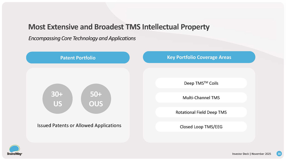 Economic Impact of Reimbursement 29 Investor Deck | November 2025 Flexible Pricing Options Verified Return - on - Investment Up to $10k Revenue per Depression Patient Highly Profitable Procedure Increased Utilization 3 well - established CPT codes Reimbursement 250M+ covered for Depression Medicare & major commercial insurers in all 50 states 100M+ covered for OCD New policies – Cigna, Palmetto, Centene, HCSC, Tricare Strong Economic and Clinical Incentive for Adopters Robust Reimbursement Coverage Drives Compelling Clinician ROI 30+ US 50+ OUS Deep TMS TM Coils Multi - Channel TMS Rotational Field Deep TMS Closed Loop TMS/EEG Issued Patents or Allowed Applications Most Extensive and Broadest TMS Intellectual Property Encompassing Core Technology and Applications Key Portfolio Coverage Areas Patent Portfolio 30 Investor Deck | November 2025