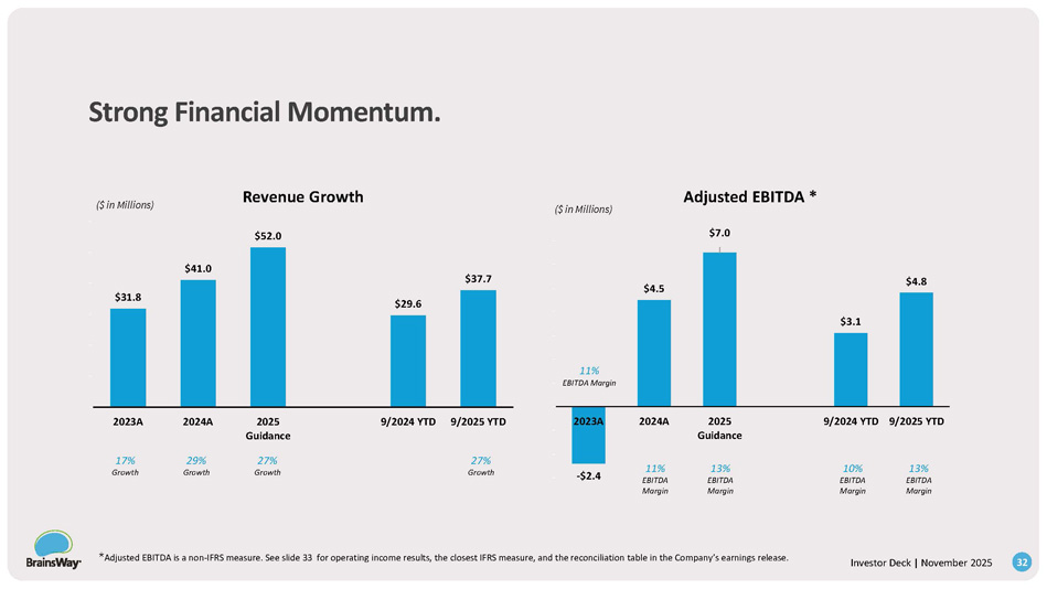 BrainsWay: Global Leader in Transcranial Magnetic Stimulation (TMS) September 16, 2025: FDA Clearance for Accelerated Deep TMS Protocol for MDD Established reimbursement 2013 - Major Depressive Disorder (MDD) 2018 - Obsessive - Compulsive Disorder (OCD) 2020 - Smoking Addiction 2021 - Anxious Depression Installed base of >1,600 systems > 7M individual treatment 4 FDA - cleared indications 3 Investor Deck | November 2025 Q3 2025 Highlights Strong Growth & Profitability • Revenue: $13.5 M (+29% YoY) • Gross Margin: 75% • Adjusted EBITDA *: $2.0 M (+81%) • Net Profit: $1.6 M (+137%) • Cash: ~$71 M as of Sept 30, 2025 Momentum Across the Business • Remaining Performance Obligations: $65 M (up 37% YoY) • Shipments: 90 Deep TMS systems (+43%), installed base >1,600 • ~70% of new engagements as multi - year leases • FDA Clearance: Accelerated protocol for Major Depressive Disorder (MDD) • NIH Grant: $2.5 M for Stanford/PAVIR study on Deep TMS for Alcohol Use Disorder • Strategic Investments: 4 minority stakes “We’re driving record adoption and sustained profitability, building long - term value through clinical innovation, strategic investments, and durable recurring revenue.” * Adjusted EBITDA is a non - IFRS measure. See slide 33 for operating income results, the closest IFRS measure, and the reconciliation table in the Company’s earnings release.