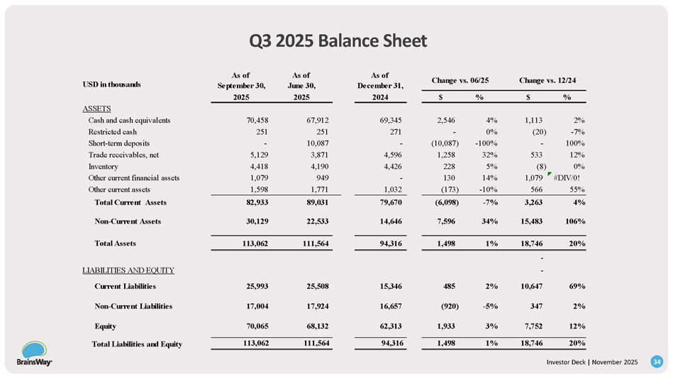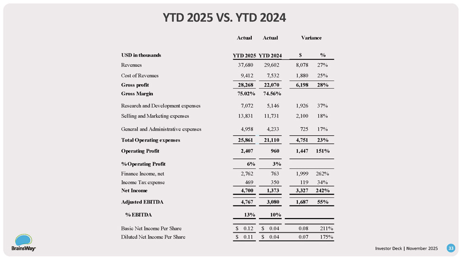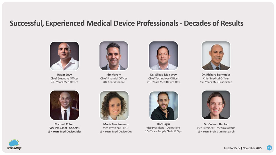 YTD 2024 Variance Actual Actual % $ YTD 2024 YTD 2025 USD in thousands 27% 8,078 29,602 37,680 Revenues 25% 1,880 7,532 9,412 Cost of Revenues 28% 6,198 22,070 28,268 Gross profit 74.56% 75.02% Gross Margin 37% 1,926 5,146 7,072 Research and Development expenses 18% 2,100 11,731 13,831 Selling and Marketing expenses 17% 725 4,233 4,958 General and Administrative expenses 23% 4,751 21,110 25,861 Total Operating expenses 151% 1,447 960 2,407 Operating Profit 3% 6% % Operating Profit 262% 1,999 763 2,762 Finance Income, net 34% 119 350 469 Income Tax expense 242% 3,327 1,373 4,700 Net Income 55% 1,687 3,080 4,767 Adjusted EBITDA 10% 13% % EBITDA 211% 0.08 $ 0.04 $ 0.12 Basic Net Income Per Share 175% 0.07 $ 0.04 $ 0.11 Diluted Net Income Per Share Investor Deck | November 2025 33 Q3 2025 Balance Sheet Change vs. 06/25 Change vs. 12/24 As of December 31, As of June 30, As of September 30, USD in thousands % $ % $ 2024 2025 2025 ASSETS 2% 1,113 4% 2,546 69,345 67,912 70,458 Cash and cash equivalents - 7% (20) 0% - 271 251 251 Restricted cash 100% - - 100% (10,087) - 10,087 - Short - term deposits 12% 533 32% 1,258 4,596 3,871 5,129 Trade receivables, net 0% (8) 5% 228 4,426 4,190 4,418 Inventory #DIV/0! 1,079 14% 130 - 949 1,079 Other current financial assets 55% 566 - 10% (173) 1,032 1,771 1,598 Other current assets 4% 3,263 - 7% (6,098) 79,670 89,031 82,933 Total Current Assets 106% 15,483 34% 7,596 14,646 22,533 30,129 Non - Current Assets 20% 18,746 1% 1,498 94,316 111,564 113,062 Total Assets - - LIABILITIES AND EQUITY 69% 10,647 2% 485 15,346 25,508 25,993 Current Liabilities 2% 347 - 5% (920) 16,657 17,924 17,004 Non - Current Liabilities 12% 7,752 3% 1,933 62,313 68,132 70,065 Equity 20% 18,746 1% 1,498 94,316 111,564 113,062 Total Liabilities and Equity Investor Deck | November 2025 34 Moria Ben Soussan Vice President - R&D 15+ Years Med Device Dev Hadar Levy Chief Executive Officer 25 + Years Med Device Michael Cohen Vice President - US Sales 15+ Years Med Device Sales Dr. Colleen Hanlon Vice President - Medical Affairs 15+ Years Brain Stim Research Dr. Richard Bermudes Chief Medical Officer 15+ Years TMS Leadership Dr. Gilead Moiseyev Chief Technology Officer 20+ Years Med Device Dev Dor Hagai Vice President – Operations 10+ Years Supply Chain & Ops Ido Marom Chief Financial Officer 20+ Years Finance Successful, Experienced Medical Device Professionals - Decades of Results Investor Deck | November 2025 35