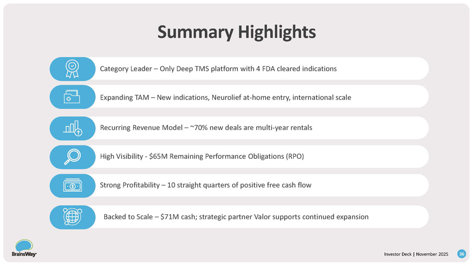 Summary Highlights Investor Deck | November 2025 36 Category Leader – Only Deep TMS platform with 4 FDA cleared indications Expanding TAM – New indications, Neurolief at - home entry, international scale Recurring Revenue Model – ~70% new deals are multi - year rentals High Visibility - $65M Remaining Performance Obligations (RPO) Strong Profitability – 10 straight quarters of positive free cash flow Backed to Scale – $71M cash; strategic partner Valor supports continued expansion References Investor Deck | November 2025 37 1.