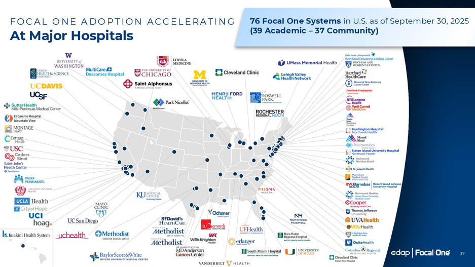 F O C A L O N E A DO P T I O N A C C E L E R A T I N G At Major Hospitals 76 Focal One Systems in U.S. as of September 30, 2025 (39 Academic – 37 Community) 37 Focal One U.S. Momentum 2021 - 2024 (Compounded Annual Growth Rates) Focal One Procedures CAGR 38 Focal One Installations CAGR 67% 51%