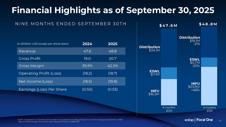 Strong Adoption by the Highest Ranked Prostate Cancer Hospitals in the US F O C A L O N E I S T HE L E A D I N G F O C A L T H E R A P Y T E C H N O L O G Y 70% 7 Out of 10 Best Hospitals for Urology National Comprehensive Cancer Network® 52% 17 Out of 33 NCCN Member Institutions 60% 21 Out of 35 SUO Approved Programs 39 T HR E E M O N T HS E N D E D S E P T E M B E R 3 0 T H 2025 2024 (in $Million USD except per share data) 16.1 14.4 Revenue 6.9 5.7 Gross Profit 43.0% 39.4% Gross Margin (5.7) (6.4) Operating Profit (Loss) (5.8) (7.0) Net Income (Loss) (0.16) (0.19) Earnings (Loss) Per Share HIFU $4.9M HIFU $7.7M +57% 3 months 2024 3 months 2025 $ 1 4 . 4 M Distribution $6.3M - 14% Distribution $7.3M ESWL $2.1M - 4% ESWL $2.2M NOTE: Translated for convenience of the reader to U.S. dollars at the 2025 average three months’ exchange rate of 1 Euro = 1.1620 USD, and 2024 average three months’ exchange rate of 1 Euro = 1.1010 USD 41 $ 1 6 .