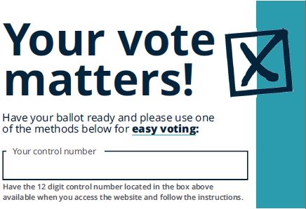 Your vote matters! Have your ballot ready and please use one of the methods below for easy voting: Your control number