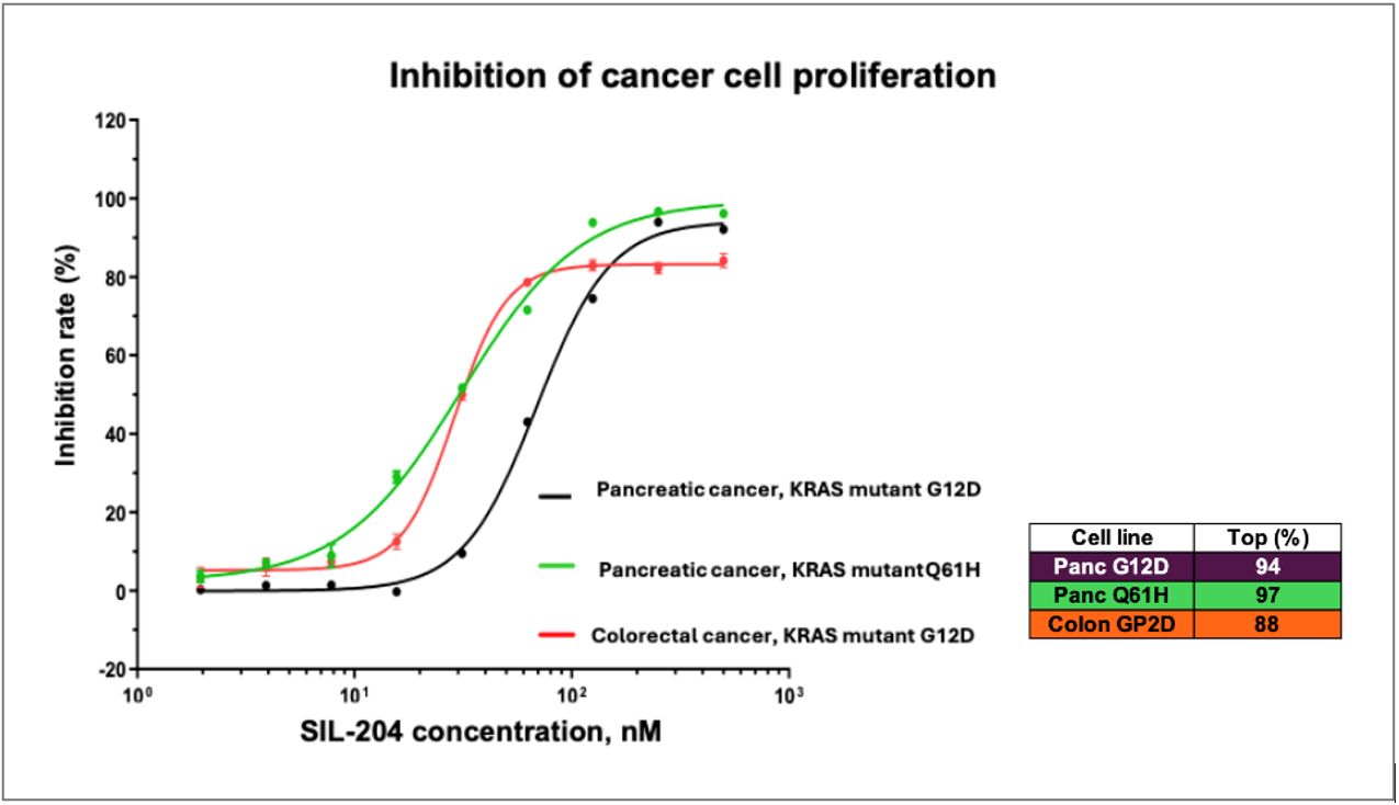 SIL204 demonstrated dose-dependent inhibition of up to 94% in pancreatic cancer cells harboring KRAS G12D mutations at nanomolar concentrations