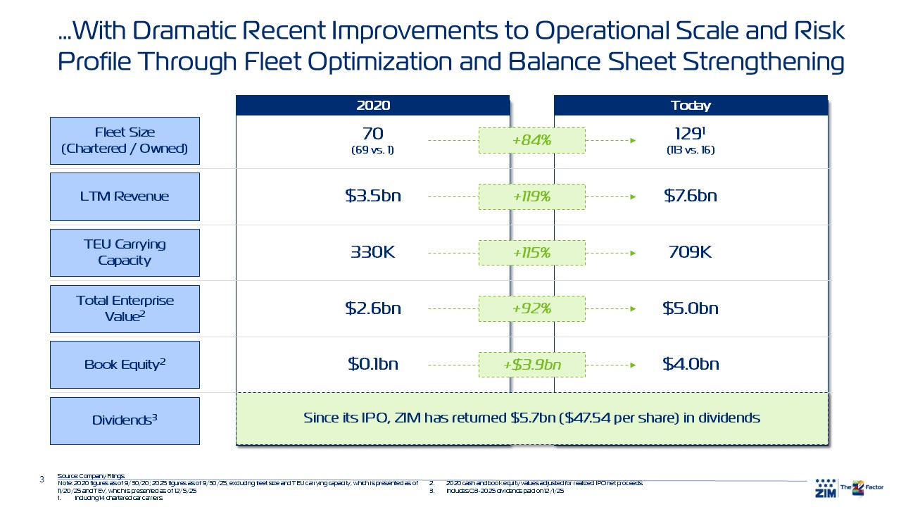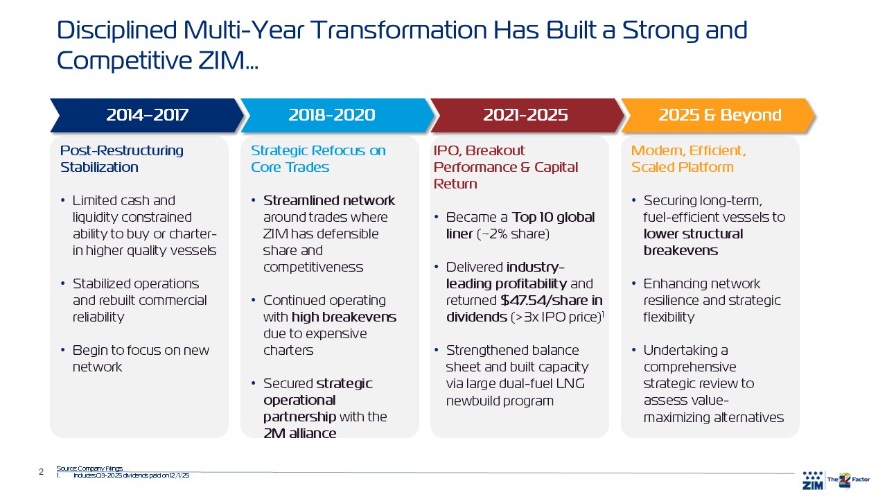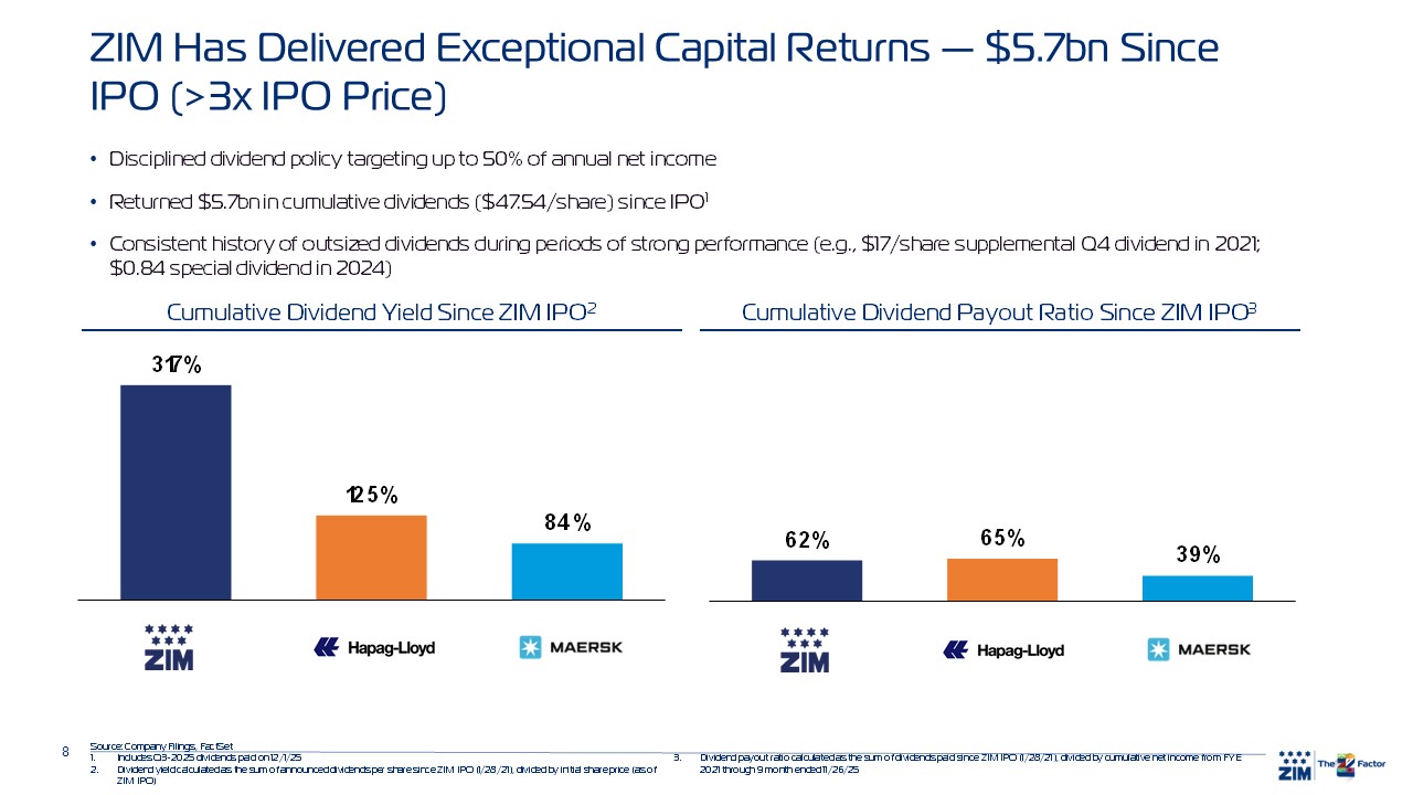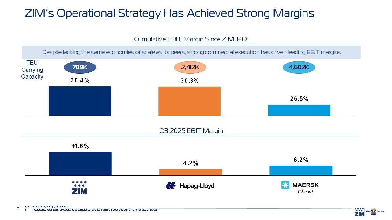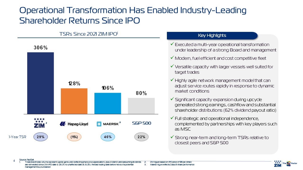 Since our IPO in 2021, ZIM has delivered peer-leading total shareholder returns of more than 300%, significantly outperforming larger global carriers and the S&P 5001. This outperformance is the result