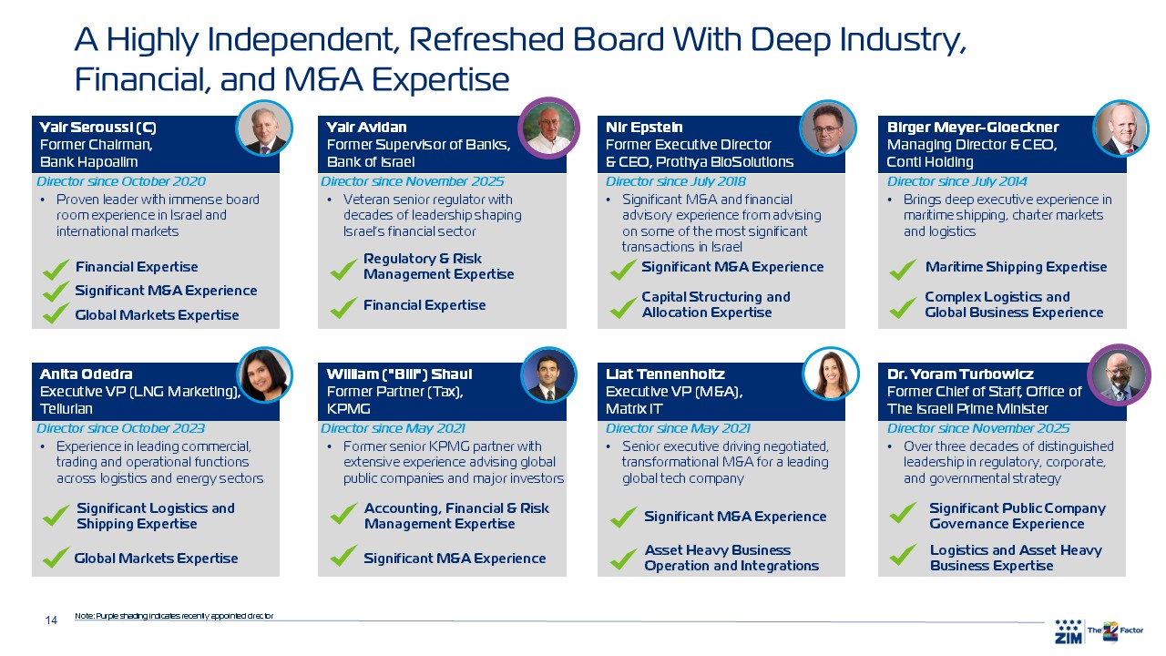 ZIM benefits from an independent, significantly refreshed Board, with five of eight directors added since the IPO, including two newly appointed directors who bring substantial financial, M&A, regulatory, and
