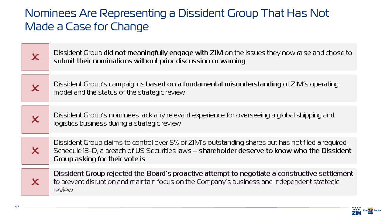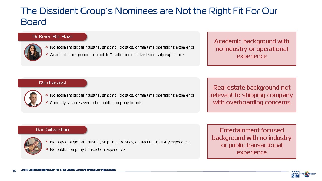 contrast to the capabilities required to oversee ZIM’s global footprint or the ongoing strategic review and the dissident group has not provided any reason why their hand-picked directors are qualified to oversee a global shipping company.