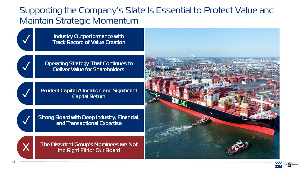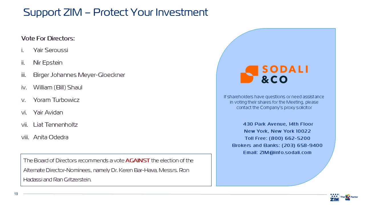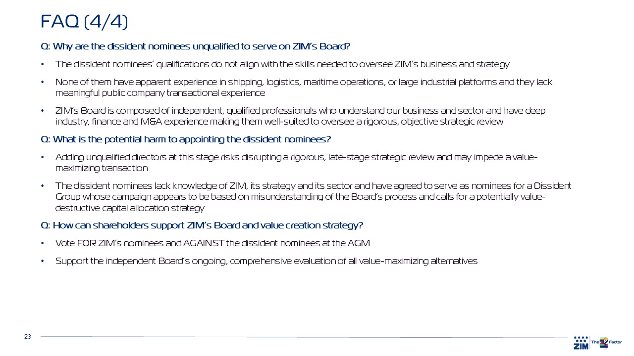 For these reasons, we strongly urge you to vote FOR ALL eight of ZIM’s director nominees and AGAINST the dissident nominees at the upcoming Annual General Meeting.