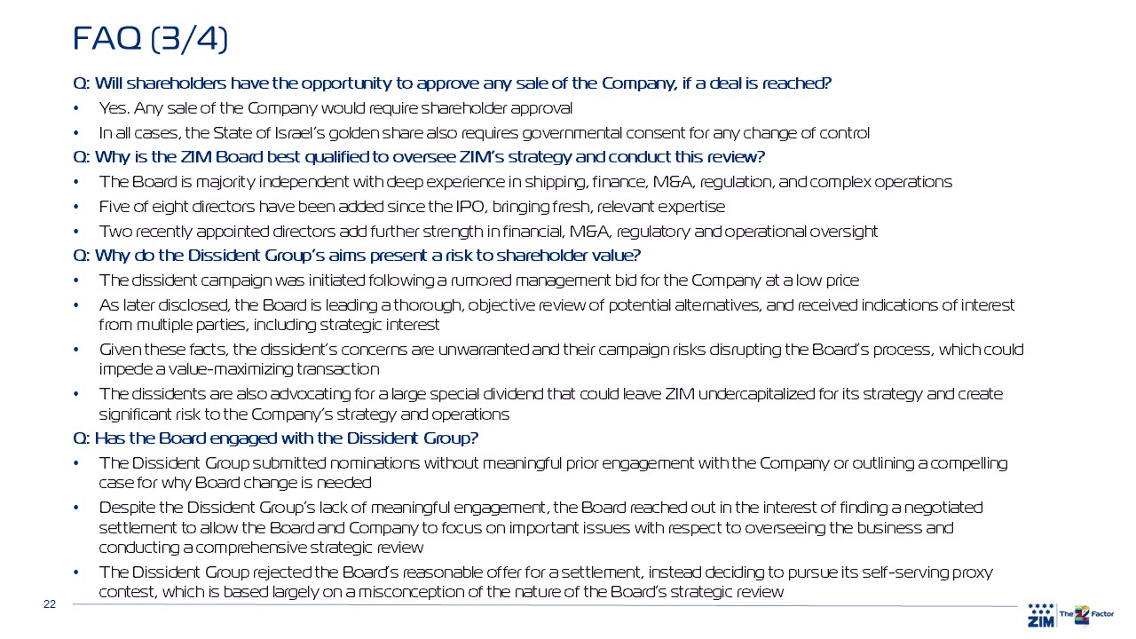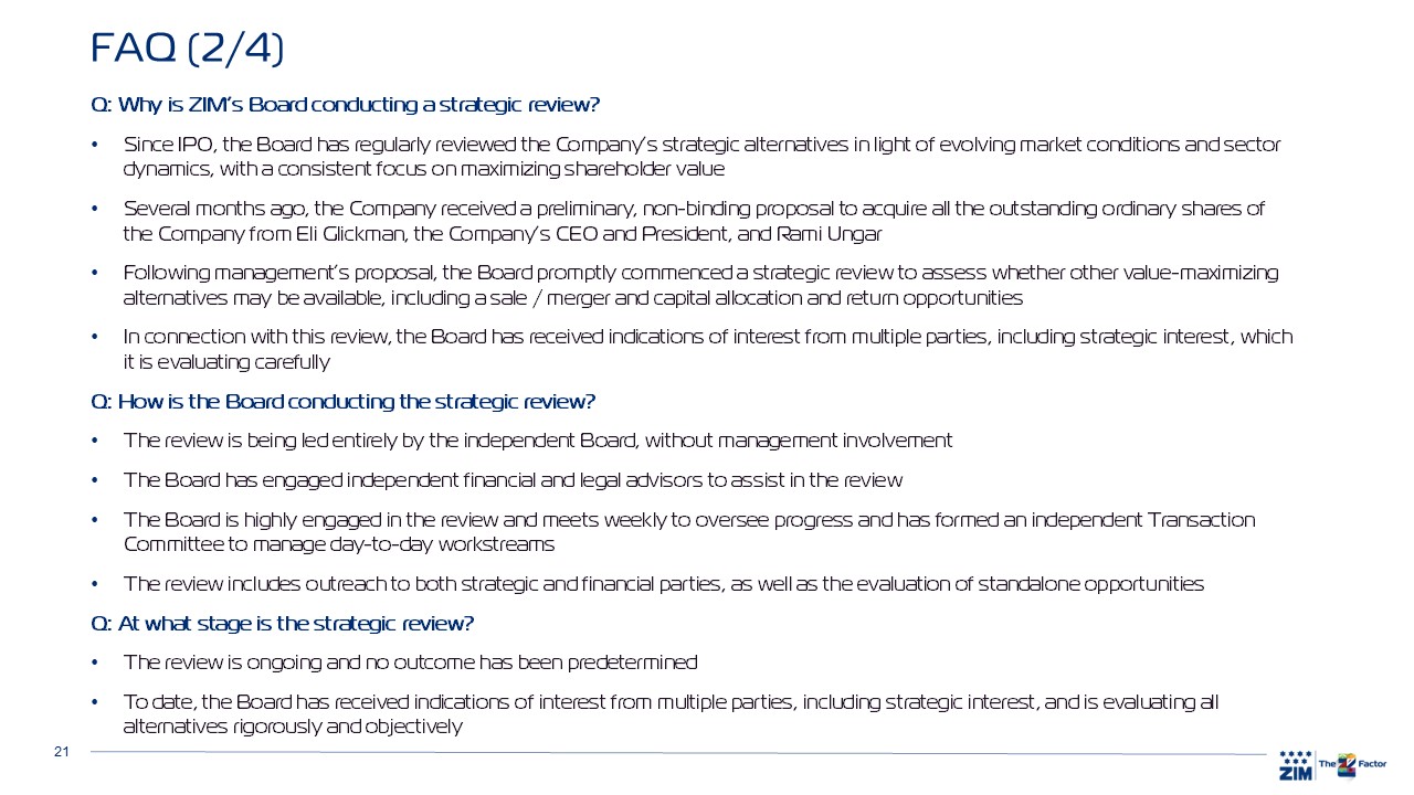 and commitment to shareholder value and providing an update on ZIM’s ongoing strategic review process and the proxy fight led by Mor Gemel & Pension Ltd., Reading Capital Ltd., and Sparta 24 Ltd. The presentation and letter to shareholders