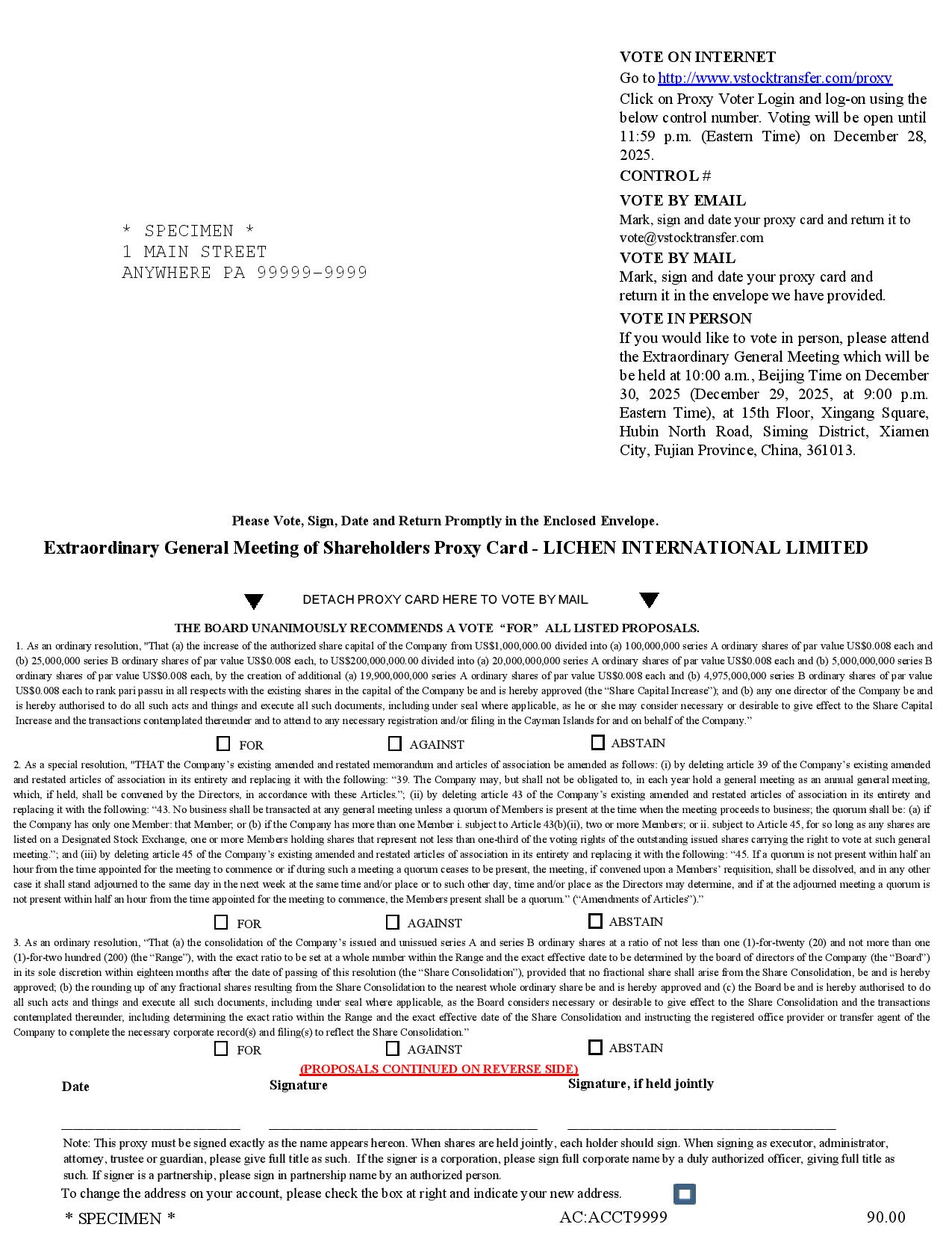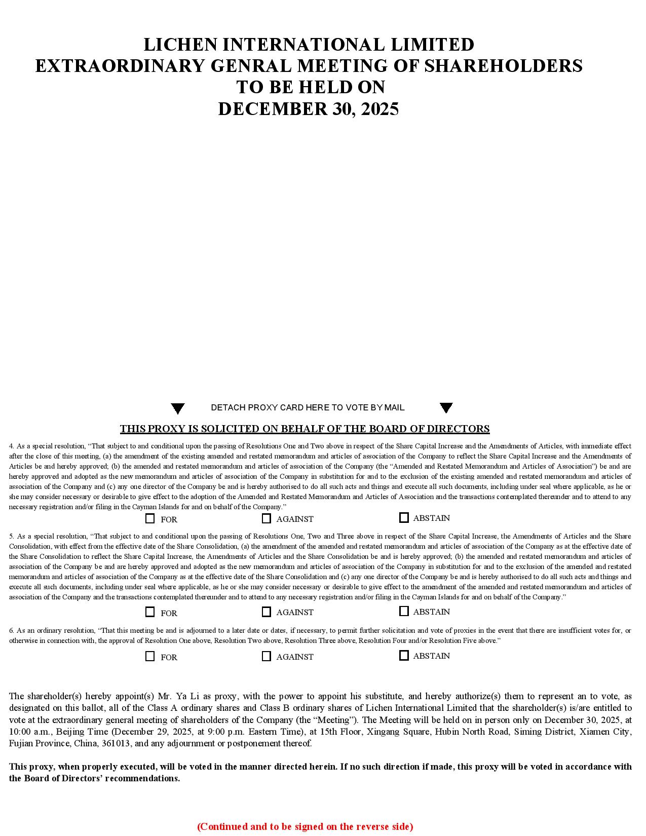 Notice is hereby given that an extraordinary general meeting (the “Meeting”) of Lichen International Limited., a Cayman Islands exempted company (the “Company”), will be held on December 30, 2025, at 10:00 a.m., Beijing Time (December 29, 2025, at 9:00 p.m. Eastern Time), at 15th Floor, Xingang Square, Hubin North Road, Siming District, Xiamen City, Fujian Province, China, 361013, for the purpose of considering and, if thought fit, passing (with or without amendments) the following resolutions of the Company: