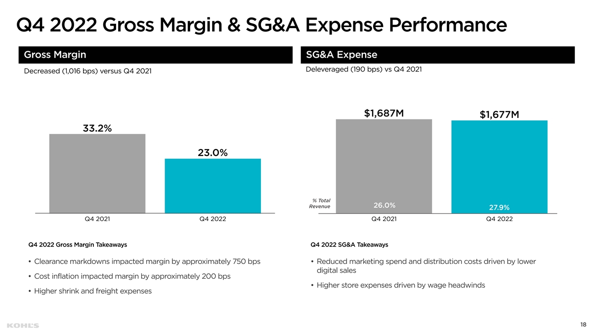 | • | 売上高総利益率は、1,016ベーシスポイント減少し、23.0%となりました。クリアランスマークダウンは約750ベーシスポイント、製品コストの上昇は約200ベーシスポイントの影響 を受けました。 |