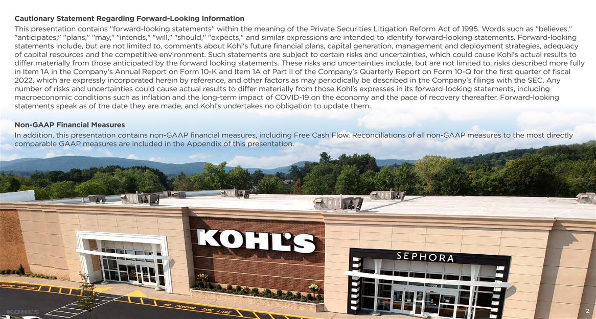 2023 年 3 月 1 日、Kohl's Corporation(以下、「当社」)は、2023 年 1 月 28 日に終了した四半期および年度の業績を報告し、2023 年度の業績見通しを示すプレスリリースを発表しました。このプレスリリースのコピーは別紙99.1として添付され、参照することにより本書に組み込まれています。2023 年 3 月 1 日の四半期決算コンファレンス・コールのプレゼンテーション資料のコピーは、別紙 99.2 として添付され、参照することにより本書に組み込まれます。