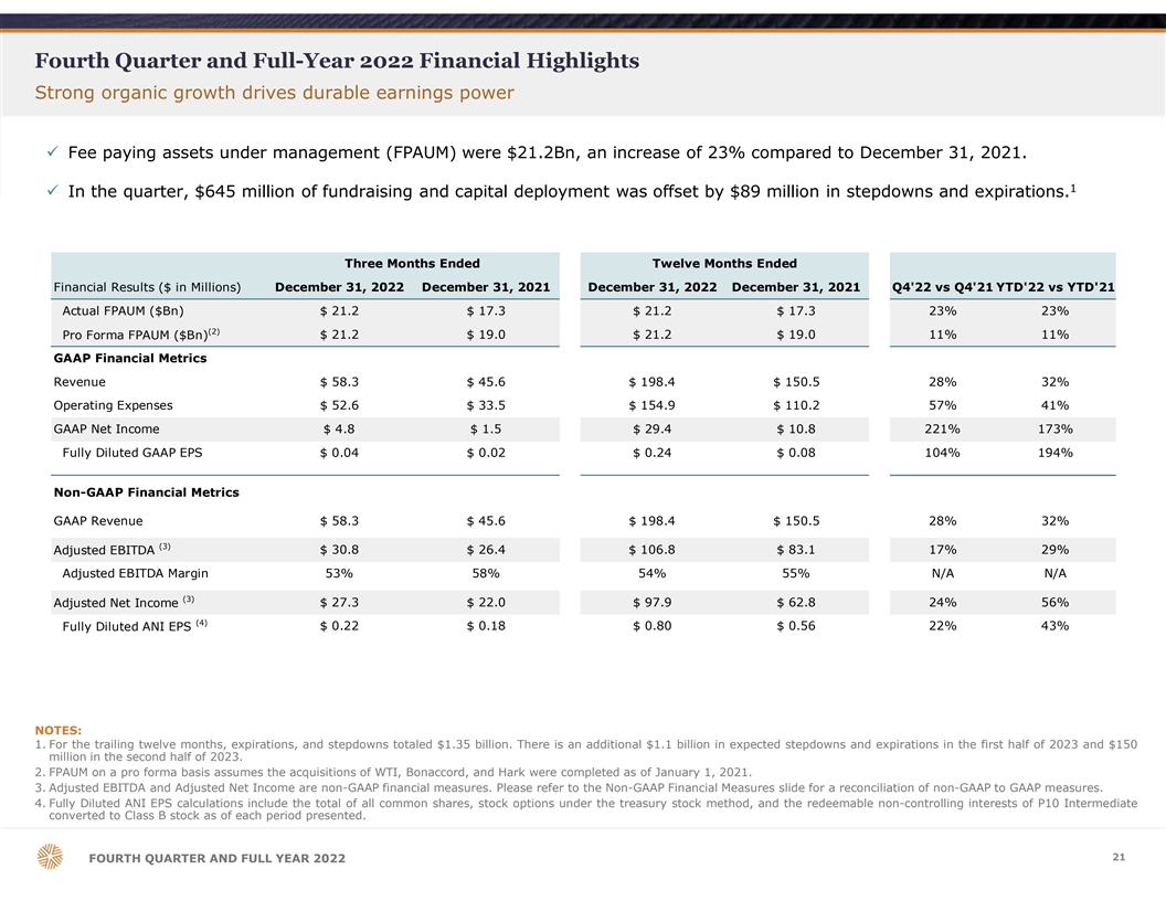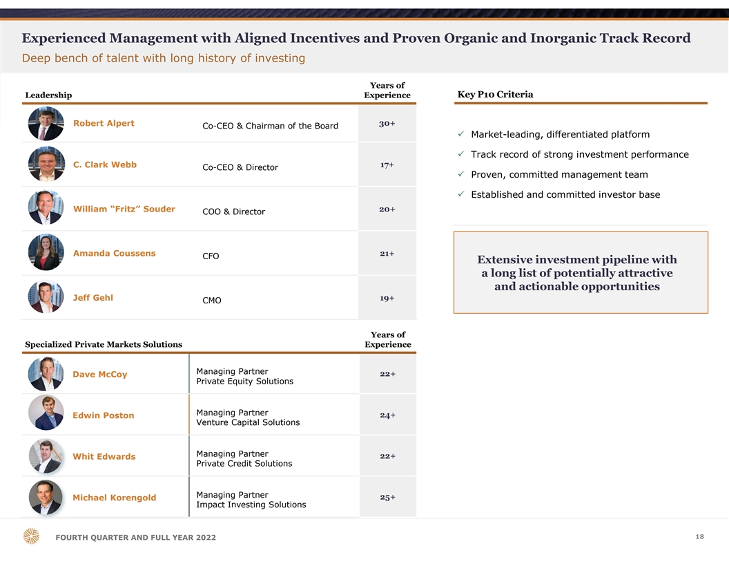会長兼共同CEOのロバート・アルパートと共同CEOのクラーク・ウェッブは、「P10は2桁の成長を遂げ、第4四半期と2022年通年で力強い収益性を達成しました。さまざまな市場サイクルを通して投資してきた長い実績を持つ、拡大する多様な戦略に後押しされ、ミドル・ローミドル市場における最高のプライベートマーケット専門ソリューションプロバイダーとしての地位を強化することができました。私たちは、継続的な成長に向けて十分な位置にあります。"
