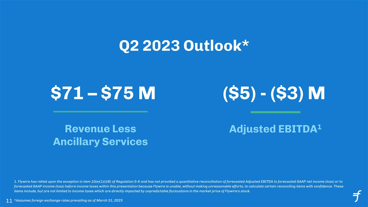 | ** | Flywire has relied upon the exception in item 10(e)(1)(i)(B) of Regulation S-K and has not provided a quantitative reconciliation of forecasted Adjusted EBITDA to forecasted GAAP net income (loss) or to forecasted GAAP income (loss) before income taxes within this earnings release because Flywire is unable, without making unreasonable efforts, to calculate certain reconciling items with confidence. These items include, but are not limited to income taxes which are directly impacted by unpredictable fluctuations in the market price of Flywire’s stock. |