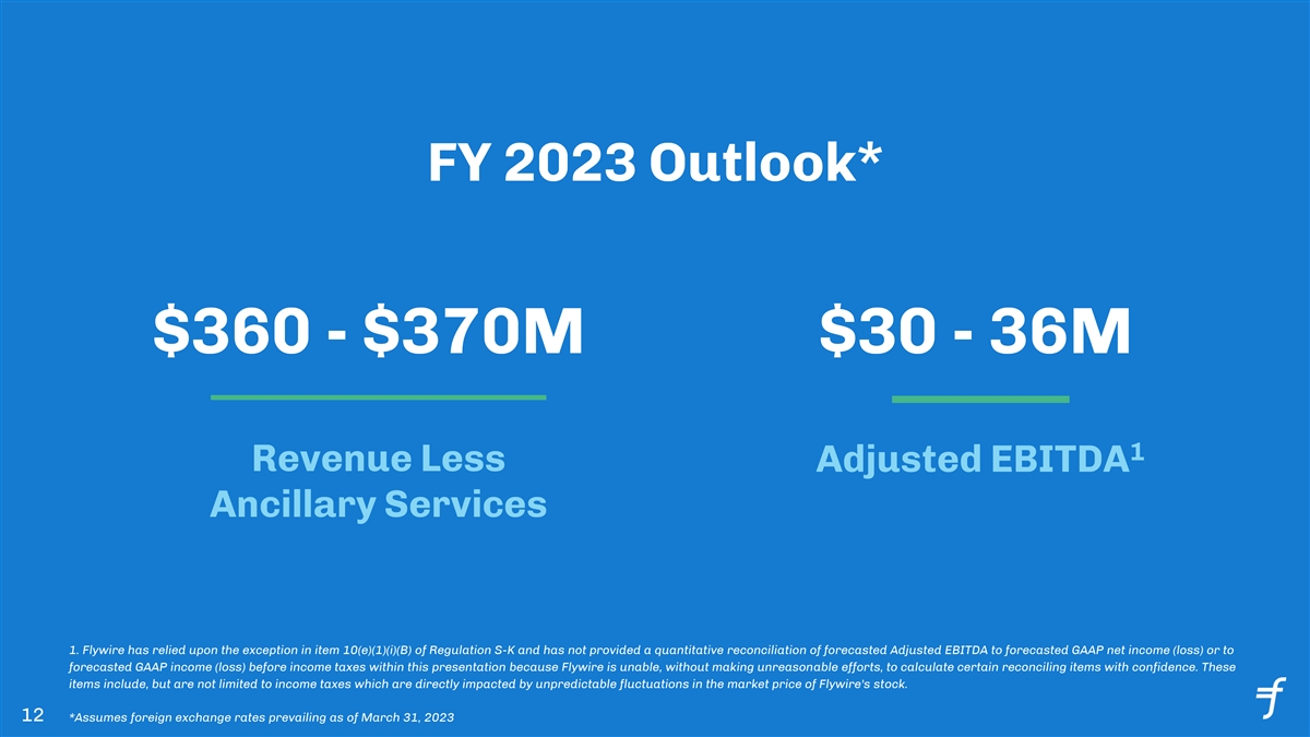 Q2 2023 Outlook* $71 – $75 M ($5) - ($3) M 1 Revenue Less Adjusted EBITDA Ancillary Services 1. Flywire has relied upon the exception in item 10(e)(1)(i)(B) of Regulation S-K and has not provided a quantitative reconciliation of forecasted Adjusted EBITDA to forecasted GAAP net income (loss) or to forecasted GAAP income (loss) before income taxes within this presentation because Flywire is unable, without making unreasonable efforts, to calculate certain reconciling items with confidence. These items include, but are not limited to income taxes which are directly impacted by unpredictable fluctuations in the market price of Flywire's stock. *Assumes foreign exchange rates prevailing as of March 31, 2023 11