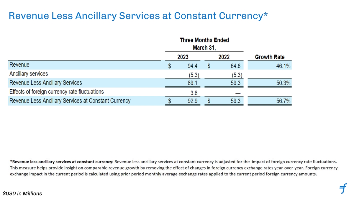 First Quarter Revenue Less Ancillary Services Increased 50.3% Year-over-Year or 56.7% on a Constant Currency Basis