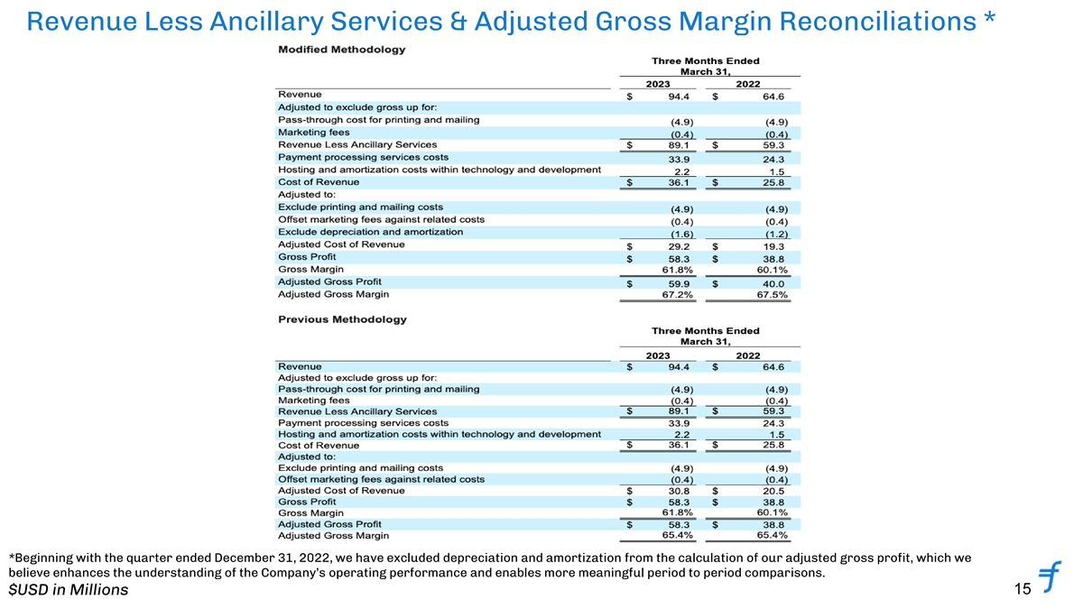 Revenue Less Ancillary Services & Adjusted Gross Margin Reconciliations * *Beginning with the quarter ended December 31, 2022, we have excluded depreciation and amortization from the calculation of our adjusted gross profit, which we believe enhances the understanding of the Company’s operating performance and enables more meaningful period to period comparisons. 15 $USD in Millions