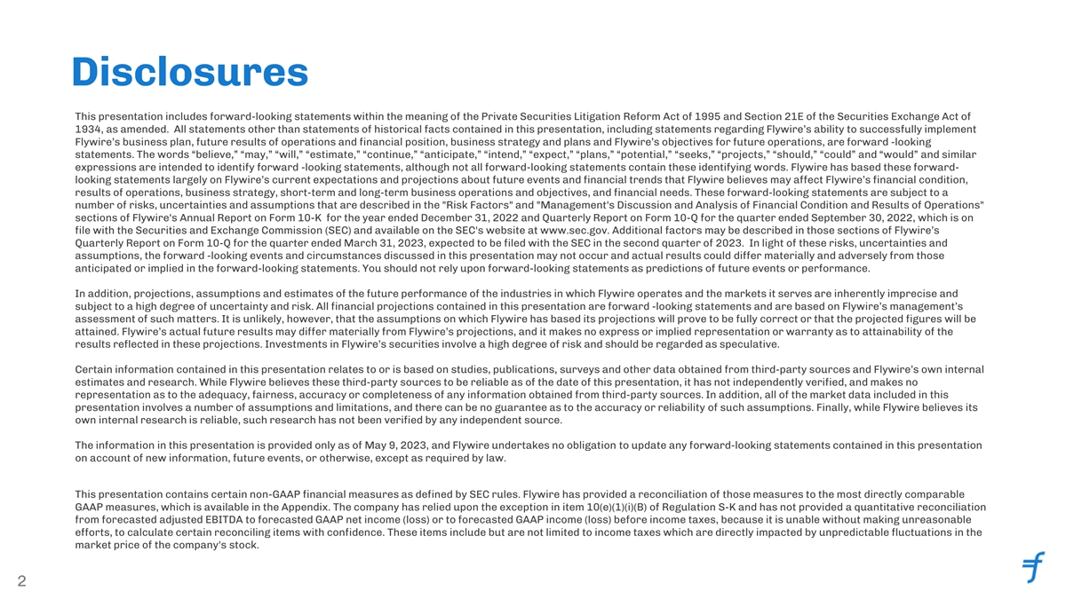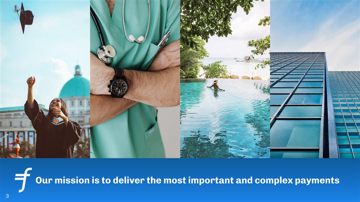 Disclosures This presentation includes forward-looking statements within the meaning of the Private Securities Litigation Reform Act of 1995 and Section 21E of the Securities Exchange Act of 1934, as amended. All statements other than statements of historical facts contained in this presentation, including statements regarding Flywire’s ability to successfully implement Flywire’s business plan, future results of operations and financial position, business strategy and plans and Flywire’s objectives for future operations, are forward -looking statements. The words “believe,” “may,” “will,” “estimate,” “continue,” “anticipate,” “intend,” “expect,” “plans,” “potential,” “seeks,” “projects,” “should,” “could” and “would” and similar expressions are intended to identify forward -looking statements, although not all forward-looking statements contain these identifying words. Flywire has based these forward- looking statements largely on Flywire’s current expectations and projections about future events and financial trends that Flywire believes may affect Flywire’s financial condition, results of operations, business strategy, short-term and long-term business operations and objectives, and financial needs. These forward-looking statements are subject to a number of risks, uncertainties and assumptions that are described in the Risk Factors and Management's Discussion and Analysis of Financial Condition and Results of Operations sections of Flywire's Annual Report on Form 10-K for the year ended December 31, 2022 and Quarterly Report on Form 10-Q for the quarter ended September 30, 2022, which is on file with the Securities and Exchange Commission (SEC) and available on the SEC's website at www.sec.gov. Additional factors may be described in those sections of Flywire’s Quarterly Report on Form 10-Q for the quarter ended March 31, 2023, expected to be filed with the SEC in the second quarter of 2023. In light of these risks, uncertainties and assumptions, the forward -looking events and circumstances discussed in this presentation may not occur and actual results could differ materially and adversely from those anticipated or implied in the forward-looking statements. You should not rely upon forward-looking statements as predictions of future events or performance. In addition, projections, assumptions and estimates of the future performance of the industries in which Flywire operates and the markets it serves are inherently imprecise and subject to a high degree of uncertainty and risk. All financial projections contained in this presentation are forward -looking statements and are based on Flywire’s management’s assessment of such matters. It is unlikely, however, that the assumptions on which Flywire has based its projections will prove to be fully correct or that the projected figures will be attained. Flywire’s actual future results may differ materially from Flywire’s projections, and it makes no express or implied representation or warranty as to attainability of the results reflected in these projections. Investments in Flywire’s securities involve a high degree of risk and should be regarded as speculative. Certain information contained in this presentation relates to or is based on studies, publications, surveys and other data obtained from third-party sources and Flywire’s own internal estimates and research. While Flywire believes these third-party sources to be reliable as of the date of this presentation, it has not independently verified, and makes no representation as to the adequacy, fairness, accuracy or completeness of any information obtained from third-party sources. In addition, all of the market data included in this presentation involves a number of assumptions and limitations, and there can be no guarantee as to the accuracy or reliability of such assumptions. Finally, while Flywire believes its own internal research is reliable, such research has not been verified by any independent source. The information in this presentation is provided only as of May 9, 2023, and Flywire undertakes no obligation to update any forward-looking statements contained in this presentation on account of new information, future events, or otherwise, except as required by law. This presentation contains certain non-GAAP financial measures as defined by SEC rules. Flywire has provided a reconciliation of those measures to the most directly comparable GAAP measures, which is available in the Appendix. The company has relied upon the exception in item 10(e)(1)(i)(B) of Regulation S-K and has not provided a quantitative reconciliation from forecasted adjusted EBITDA to forecasted GAAP net income (loss) or to forecasted GAAP income (loss) before income taxes, because it is unable without making unreasonable efforts, to calculate certain reconciling items with confidence. These items include but are not limited to income taxes which are directly impacted by unpredictable fluctuations in the market price of the company's stock. 2