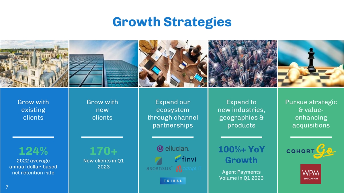 Growth Strategies Grow with Grow with Expand our Expand to Pursue strategic existing new ecosystem new industries, & value- clients clients through channel geographies & enhancing partnerships products acquisitions 100%+ YoY 124% 170+ 2022 average New clients in Q1 Growth annual dollar-based 2023 Agent Payments net retention rate Volume in Q1 2023 7