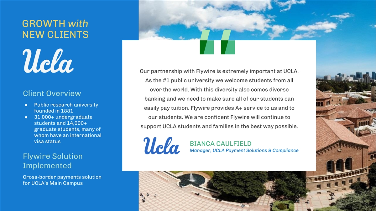 GROWTH with NEW CLIENTS Our partnership with Flywire is extremely important at UCLA. As the #1 public university we welcome students from all over the world. With this diversity also comes diverse Client Overview banking and we need to make sure all of our students can ● Public research university easily pay tuition. Flywire provides A+ service to us and to founded in 1881 ● 31,000+ undergraduate our students. We are confident Flywire will continue to students and 14,000+ support UCLA students and families in the best way possible. graduate students, many of whom have an international visa status BIANCA CAULFIELD Manager, UCLA Payment Solutions & Compliance Flywire Solution Implemented Cross-border payments solution for UCLA’s Main Campus