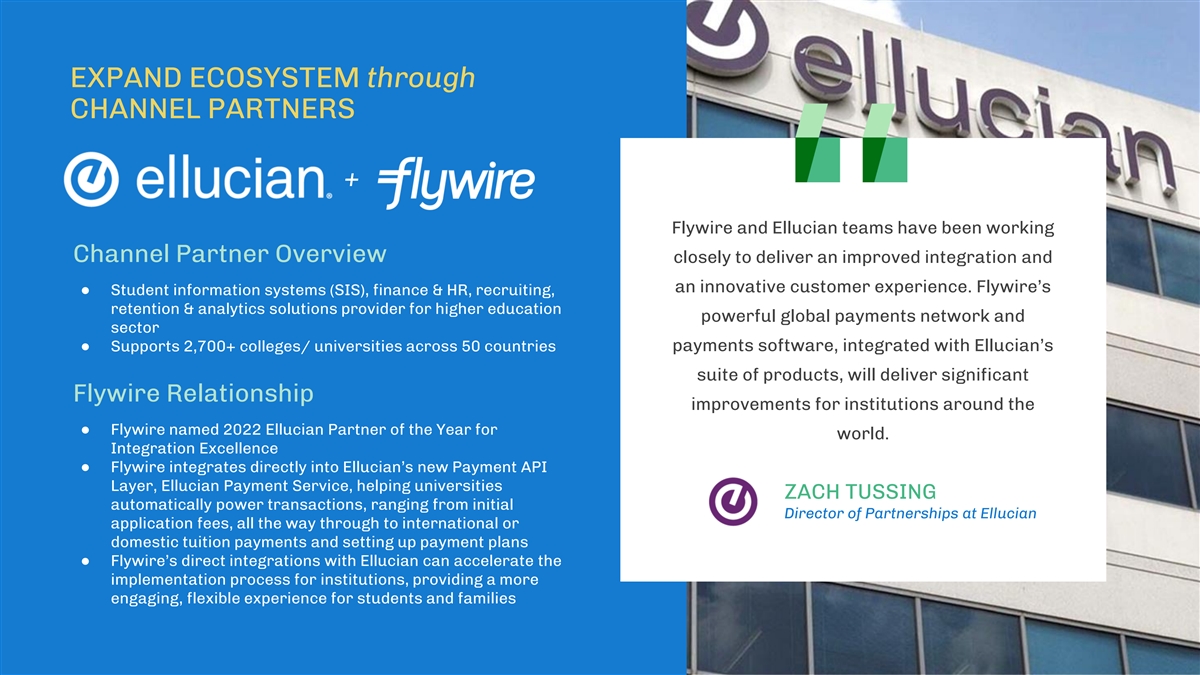EXPAND ECOSYSTEM through CHANNEL PARTNERS + Flywire and Ellucian teams have been working Channel Partner Overview closely to deliver an improved integration and an innovative customer experience. Flywire’s ● Student information systems (SIS), finance & HR, recruiting, retention & analytics solutions provider for higher education powerful global payments network and sector ● Supports 2,700+ colleges/ universities across 50 countries payments software, integrated with Ellucian’s suite of products, will deliver significant Flywire Relationship improvements for institutions around the ● Flywire named 2022 Ellucian Partner of the Year for world. Integration Excellence ● Flywire integrates directly into Ellucian’s new Payment API Layer, Ellucian Payment Service, helping universities ZACH TUSSING automatically power transactions, ranging from initial Director of Partnerships at Ellucian application fees, all the way through to international or domestic tuition payments and setting up payment plans ● Flywire’s direct integrations with Ellucian can accelerate the implementation process for institutions, providing a more engaging, flexible experience for students and families