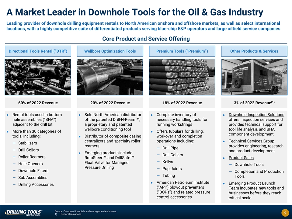 Expansive Offering to Supply Drilling Tools Required in a Typical Job Diverse and extensive inventory of tools to address the wide-ranging needs of oil & gas customers across all regions Blow Out Preventer Represents Key DTI Rental Product Crossover Subs Hevi-Wate Drill Pipe Drill Pipe Non-Magnetic Collar TM Drill-N-Ream TM Spiral Drill Collar RotoSteer Stabilizer Bit Sub 8