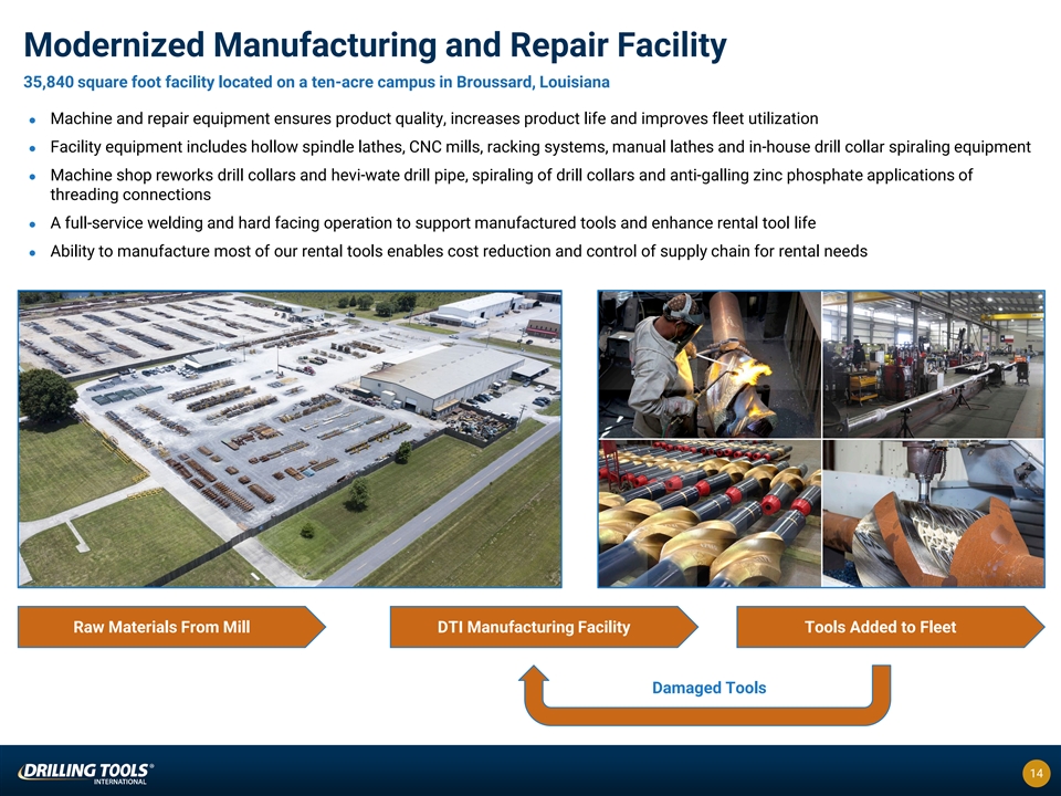 Strong Permian Presence in both Midland and Delaware Basins DTI has an extensive footprint within the Permian Basin, providing numerous services to clients operating in one of the most prolific oil and gas basin (1) Midland DTR Campus Space (sq. ft.) 57,246 Acres 14 Segments Served DTR Midland DNR Facility Space (sq. ft.) 12,000 Acres 3.5 Carlsbad, NM Segments Served Multiple Midland, TX New Mexico (2) Odessa DMS Facility Odessa, TX Texas Space (sq. ft.) 9,000 Acres 5 Segments Served Multiple Odessa Premium Tools Facility Space (sq. ft.) 17,417 Acres 11 Segments Served Premium Carlsbad Facility Space (sq. ft.) 4,000 Acres 2.5 Segments Served DNR 1) Includes aggregate square footage from five buildings. 2) Downhole machining solutions. 13