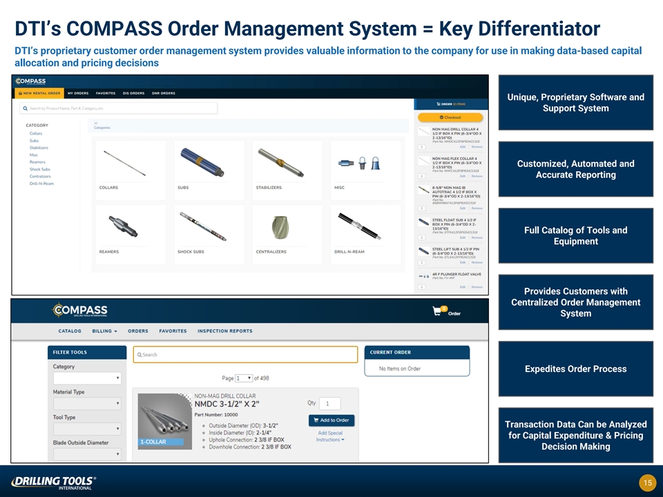 Modernized Manufacturing and Repair Facility 35,840 square foot facility located on a ten-acre campus in Broussard, Louisiana l Machine and repair equipment ensures product quality, increases product life and improves fleet utilization l Facility equipment includes hollow spindle lathes, CNC mills, racking systems, manual lathes and in-house drill collar spiraling equipment l Machine shop reworks drill collars and hevi-wate drill pipe, spiraling of drill collars and anti-galling zinc phosphate applications of threading connections l A full-service welding and hard facing operation to support manufactured tools and enhance rental tool life l Ability to manufacture most of our rental tools enables cost reduction and control of supply chain for rental needs Raw Materials From Mill DTI Manufacturing Facility Tools Added to Fleet Damaged Tools 14