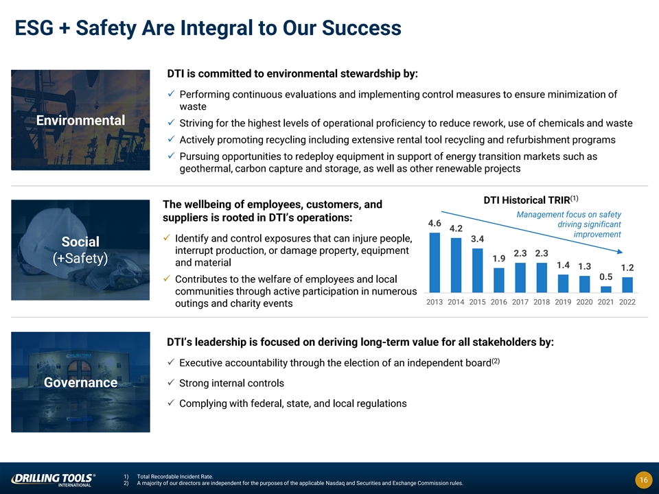 DTI’s COMPASS Order Management System = Key Differentiator DTI’s proprietary customer order management system provides valuable information to the company for use in making data-based capital allocation and pricing decisions Unique, Proprietary Software and Support System Customized, Automated and Accurate Reporting Full Catalog of Tools and Equipment Provides Customers with Centralized Order Management System Expedites Order Process Transaction Data Can be Analyzed for Capital Expenditure & Pricing Decision Making 15