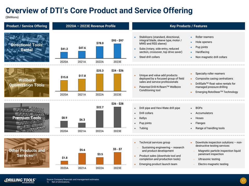 ESG + Safety Are Integral to Our Success DTI is committed to environmental stewardship by: ü Performing continuous evaluations and implementing control measures to ensure minimization of waste Environmental ü Striving for the highest levels of operational proficiency to reduce rework, use of chemicals and waste ü Actively promoting recycling including extensive rental tool recycling and refurbishment programs ü Pursuing opportunities to redeploy equipment in support of energy transition markets such as geothermal, carbon capture and storage, as well as other renewable projects (1) DTI Historical TRIR The wellbeing of employees, customers, and Management focus on safety suppliers is rooted in DTI’s operations: 4.6 driving significant 4.2 improvement ü Identify and control exposures that can injure people, 3.4 Social interrupt production, or damage property, equipment 2.3 2.3 1.9 (+Safety) and material 1.4 1.3 1.2 0.5 ü Contributes to the welfare of employees and local communities through active participation in numerous 2013 2014 2015 2016 2017 2018 2019 2020 2021 2022 outings and charity events DTI’s leadership is focused on deriving long-term value for all stakeholders by: (2) ü Executive accountability through the election of an independent board Governanceü Strong internal controls ü Complying with federal, state, and local regulations 1) Total Recordable Incident Rate. 16 2) A majority of our directors are independent for the purposes of the applicable Nasdaq and Securities and Exchange Commission rules.