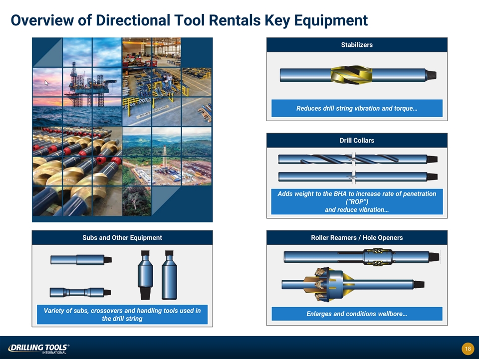Overview of DTI’s Core Product and Service Offering ($Millions) Product / Service Offering 2020A – 2023E Revenue Profile Key Products / Features l Stabilizers (standard, directional,l Roller reamers integral blade, sleeve type, motor / $95 - $97 l Hole openers $78.0 MWD and RSS sleeve) Directional Tools l Pup joints $47.6 l Subs (rotary, side entry, reduced $41.2 Rental section, crossover, top drive saver)l Hardfacing l Steel drill collars l Non magnetic drill collars 2020A 2021A 2022A 2023E $25.3 $24 - $26 l Specialty roller reamers l Unique and value add products $17.8 $15.8 deployed by a focused group of field l Composite casing centralizers Wellbore sales and service professionals TM l DrillSafe float valve rentals for Optimization Tools TM l Patented Drill-N-Ream Wellbore managed pressure drilling Conditioning tool TM l Emerging RotoSteer Technology 2020A 2021A 2022A 2023E $26 - $28 $22.7 l Drill pipe and Hevi-Wate drill pipel BOPs l Drill collarsl Accumulators $8.9 Premium Toolsl Kellysl Hoses $6.3 l Pup jointsl Flanges l Tubingl Range of handling tools 2020A 2021A 2022A 2023E l Technical services groupl Downhole inspection solutions – non- destructive testing services — Sustaining engineering – research $5 - $7 $5.6 Other Products and and product development — Magnetic particle inspection liquid penetrant inspection $3.5 (1) l Product sales (downhole tool and Services $1.8 completion and production tools) — Ultrasonic testing l Emerging product launch team — Electro magnetic testing 2020A 2021A 2022A 2023E Source: Company financials and management estimates. 17 1) Net of eliminations.