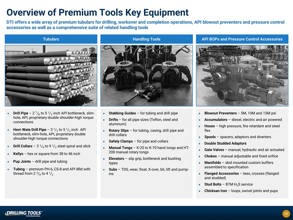 Overview of Wellbore Optimization Tools Specialty tools division with a focused group of field sales and service professionals providing rig site visits and customer service, enabling consistent product performance and customer satisfaction Products Offered Substantial Improvements in Wellbore Quality l Patented technology allows the tool to maintain TM Drill-N-Ream a market leading position (“DNR”) l Numerous benefits to the customer WellBore Conditioning (1)l Allows operators to extend length of wellbore at Tool a lower cost Specialty l Sealed bearing roller reamers Reamers, l Distributor for casing centralizers Casing Centralizers, l Specialty pressure control drill stem valve for TM DrillSafe managed pressure drilling Float Valves l 2022: finalized development l 2023: Commercially launched Jan 2023 Emerging Technology l Improves ROP, reduces torque and drag and TM “RotoSteer ” eliminates slides l Applicable to hundreds of locations 1) DTI distributes the DNR pursuant to a distribution agreement with Superior Drilling Products, Inc., the owner of the relevant patent. 19