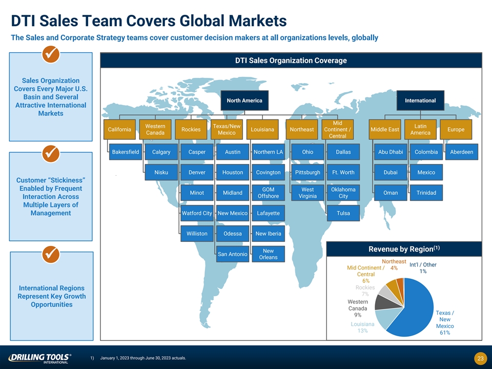 Blue-Chip Customer Base Across E&Ps & OFS Companies DTI has established an exceptional customer base that includes blue-chip E&P operators and many of the largest oilfield services companies l First-call supplier for leading oilfield service providers in North America l Over the last decade, DTI has actively expanded its customer base to further diversify its customer mix − In the six months ending June 30, 2023, DTI’s two largest customers represented approximately 30% of revenue Revenue by Customer (%) Select DTI Customers Six months ended June 30, 2023 Top Two Customers 30% >40% of revenues from customers outside the Top 10 All Other Customers 70% 22