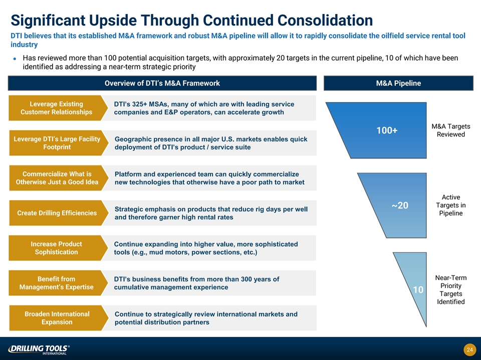 Significant Upside Through Continued Consolidation DTI believes that its established M&A framework and robust M&A pipeline will allow it to rapidly consolidate the oilfield service rental tool industry l Has reviewed more than 100 potential acquisition targets, with approximately 20 targets in the current pipeline, 10 of which have been identified as addressing a near-term strategic priority Overview of DTI’s M&A Framework M&A Pipeline Leverage Existing DTI’s 325+ MSAs, many of which are with leading service Customer Relationships companies and E&P operators, can accelerate growth M&A Targets 100+ Reviewed Leverage DTI’s Large Facility Geographic presence in all major U.S. markets enables quick Footprint deployment of DTI’s product / service suite Commercialize What is Platform and experienced team can quickly commercialize Otherwise Just a Good Idea new technologies that otherwise have a poor path to market Active Targets in ~20 Strategic emphasis on products that reduce rig days per well Create Drilling Efficiencies Pipeline and therefore garner high rental rates Increase Product Continue expanding into higher value, more sophisticated Sophistication tools (e.g., mud motors, power sections, etc.) Near-Term Benefit from DTI’s business benefits from more than 300 years of Priority Management’s Expertise cumulative management experience 10 Targets Identified Broaden International Continue to strategically review international markets and Expansion potential distribution partners 24