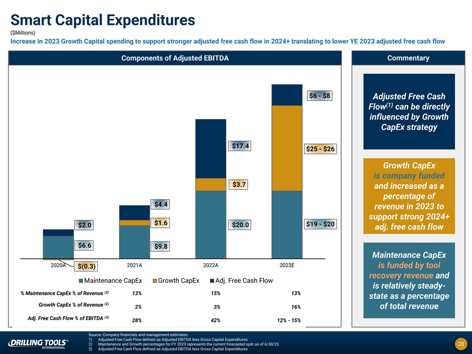 Attractive Financial Profile ($Millions) Generated positive Adjusted EBITDA margins and cash flow through the pandemic, and now boasts among the top margins and cash flow profiles in the industry Revenue Commentary $150 - $158 $129.6 $77.4 Strong and $67.6 Increasing Revenue Profile 2020A 2021A 2022A 2023E Growth Rate 14% 67% 16% - 22% (1) Adjusted EBITDA $50 - $54 $41.2 Accelerating $15.7 Adj. EBITDA and $8.3 Margin Profile 2020A 2021A 2022A 2023E (2) % Margin 20% 32% 33% - 34% (3) Adjusted Free Cash Flow $17.4 Translating to $6 - $8 $4.4 $2.0 Positive Adj. Free Cash Flow Generation 2020A 2021A 2022A 2023E (4) % Margin 6% 13% 4% - 5% Source: Company financials and management estimates. 3) Adjusted Free Cash Flow is a non-GAAP measure. For a reconciliation of net income (loss) to Adjusted 1) Adjusted EBITDA is a non-GAAP measure. For a reconciliation of net income (loss) to Free Cash Flow for each of the periods presented, please see the Appendix. 27 Adjusted EBITDA for each of the periods presented, please see the Appendix. 4) Adjusted Free Cash Flow divided by revenue in the corresponding year. 2) Adjusted EBITDA divided by revenue in the corresponding year