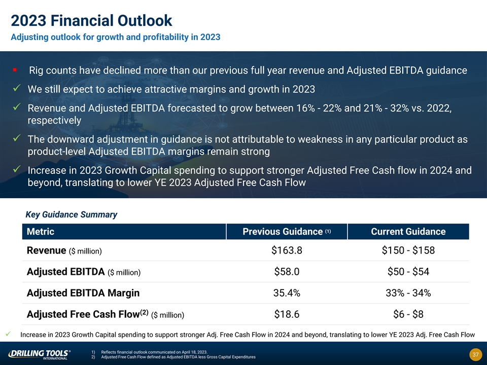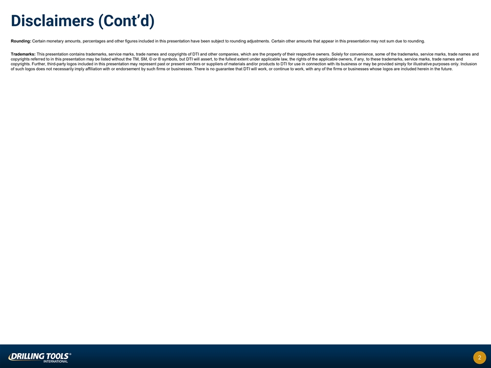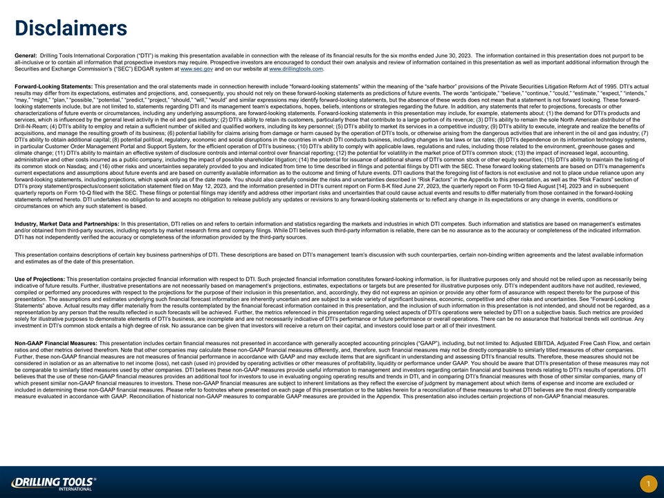 Disclaimers General: Drilling Tools International Corporation (“DTI”) is making this presentation available in connection with the release of its financial results for the six months ended June 30, 2023. The information contained in this presentation does not purport to be all-inclusive or to contain all information that prospective investors may require. Prospective investors are encouraged to conduct their own analysis and review of information contained in this presentation as well as important additional information through the Securities and Exchange Commission’s (“SEC”) EDGAR system at www.sec.gov and on our website at www.drillingtools.com. Forward-Looking Statements: This presentation and the oral statements made in connection herewith include “forward-looking statements” within the meaning of the “safe harbor” provisions of the Private Securities Litigation Reform Act of 1995. DTI’s actual results may differ from its expectations, estimates and projections, and, consequently, you should not rely on these forward-looking statements as predictions of future events. The words “anticipate,” “believe,” “continue,” “could,” “estimate,” “expect,” “intends,” “may,” “might,” “plan,” “possible,” “potential,” “predict,” “project,” “should,” “will,” “would” and similar expressions may identify forward-looking statements, but the absence of these words does not mean that a statement is not forward looking. These forward- looking statements include, but are not limited to, statements regarding DTI and its management team’s expectations, hopes, beliefs, intentions or strategies regarding the future. In addition, any statements that refer to projections, forecasts or other characterizations of future events or circumstances, including any underlying assumptions, are forward-looking statements. Forward-looking statements in this presentation may include, for example, statements about: (1) the demand for DTI’s products and services, which is influenced by the general level activity in the oil and gas industry; (2) DTI’s ability to retain its customers, particularly those that contribute to a large portion of its revenue; (3) DTI’s ability to remain the sole North American distributor of the Drill-N-Ream; (4) DTI’s ability to employ and retain a sufficient number of skilled and qualified workers, including its key personnel; (5) DTI’s ability to market its services in a competitive industry; (9) DTI’s ability to execute, integrate and realize the benefits of acquisitions, and manage the resulting growth of its business; (6) potential liability for claims arising from damage or harm caused by the operation of DTI’s tools, or otherwise arising from the dangerous activities that are inherent in the oil and gas industry; (7) DTI’s ability to obtain additional capital; (8) potential political, regulatory, economic and social disruptions in the countries in which DTI conducts business, including changes in tax laws or tax rates; (9) DTI’s dependence on its information technology systems, in particular Customer Order Management Portal and Support System, for the efficient operation of DTI’s business; (10) DTI’s ability to comply with applicable laws, regulations and rules, including those related to the environment, greenhouse gases and climate change; (11) DTI’s ability to maintain an effective system of disclosure controls and internal control over financial reporting; (12) the potential for volatility in the market price of DTI’s common stock; (13) the impact of increased legal, accounting, administrative and other costs incurred as a public company, including the impact of possible shareholder litigation; (14) the potential for issuance of additional shares of DTI’s common stock or other equity securities; (15) DTI’s ability to maintain the listing of its common stock on Nasdaq; and (16) other risks and uncertainties separately provided to you and indicated from time to time described in filings and potential filings by DTI with the SEC. These forward looking statements are based on DTI’s management's current expectations and assumptions about future events and are based on currently available information as to the outcome and timing of future events. DTI cautions that the foregoing list of factors is not exclusive and not to place undue reliance upon any forward-looking statements, including projections, which speak only as of the date made. You should also carefully consider the risks and uncertainties described in “Risk Factors” in the Appendix to this presentation, as well as the “Risk Factors” section of DTI’s proxy statement/prospectus/consent solicitation statement filed on May 12, 2023, and the information presented in DTI’s current report on Form 8-K filed June 27, 2023, the quarterly report on Form 10-Q filed August [14], 2023 and in subsequent quarterly reports on Form 10-Q filed with the SEC. These filings or potential filings may identify and address other important risks and uncertainties that could cause actual events and results to differ materially from those contained in the forward-looking statements referred hereto. DTI undertakes no obligation to and accepts no obligation to release publicly any updates or revisions to any forward-looking statements or to reflect any change in its expectations or any change in events, conditions or circumstances on which any such statement is based. Industry, Market Data and Partnerships: In this presentation, DTI relies on and refers to certain information and statistics regarding the markets and industries in which DTI competes. Such information and statistics are based on management’s estimates and/or obtained from third-party sources, including reports by market research firms and company filings. While DTI believes such third-party information is reliable, there can be no assurance as to the accuracy or comp