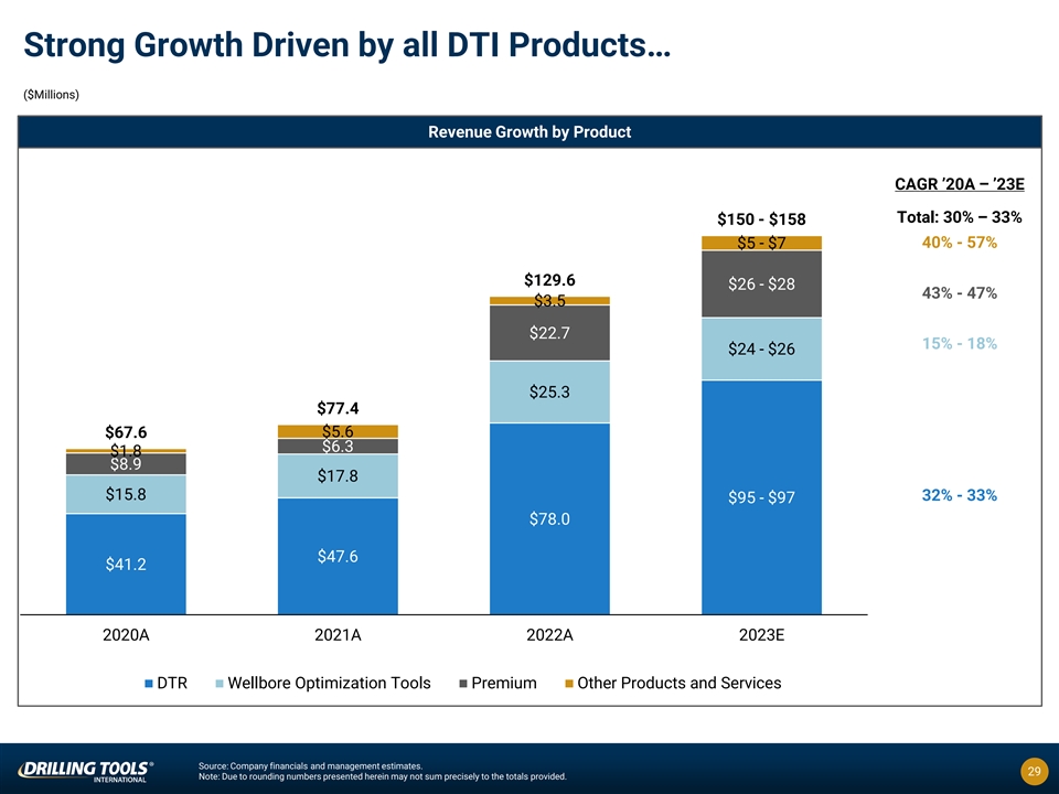Strong Growth Driven by all DTI Products… ($Millions) Revenue Growth by Product CAGR ’20A – ’23E Total: 30% – 33% $150 - $158 $5 - $7 40% - 57% $129.6 $26 - $28 43% - 47% $3.5 $22.7 15% - 18% $24 - $26 $25.3 $77.4 $67.6 $5.6 $6.3 $1.8 $8.9 $17.8 $15.8 32% - 33% $95 - $97 $78.0 $47.6 $41.2 2020A 2021A 2022A 2023E DTR Wellbore Optimization Tools Premium Other Products and Services Source: Company financials and management estimates. 29 Note: Due to rounding numbers presented herein may not sum precisely to the totals provided.